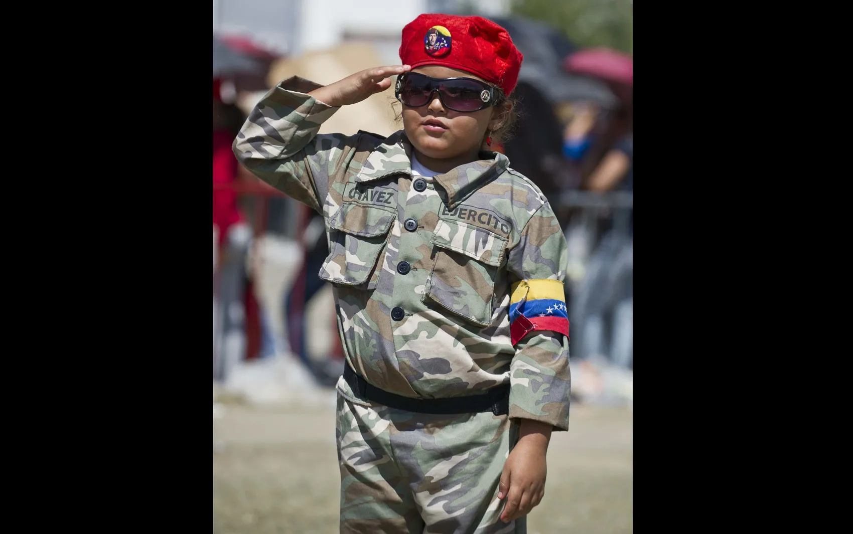 The child dressed as Hugo Chávez, salutes on March 8, 2013. (Photo by Ronaldo Schemidt/AFP Photo)