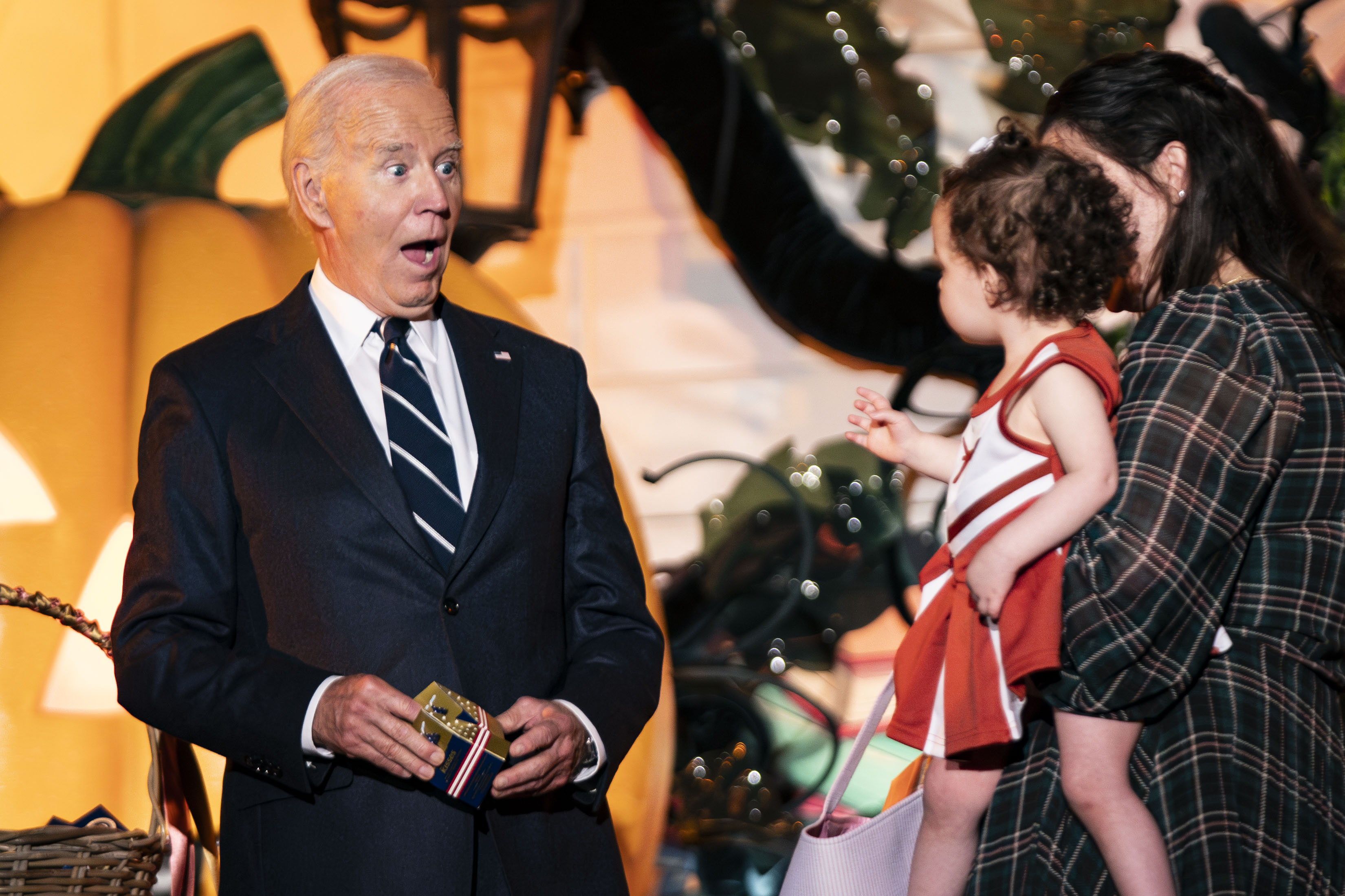 President Joe Biden celebrated Halloween by handing out candy and books to young trick-or-treaters on the South Lawn of the White House in Washington, DC. on October 30, 2024. (Photo by Bonnie Cash/Pool via CNP/Splash News and Pictures)