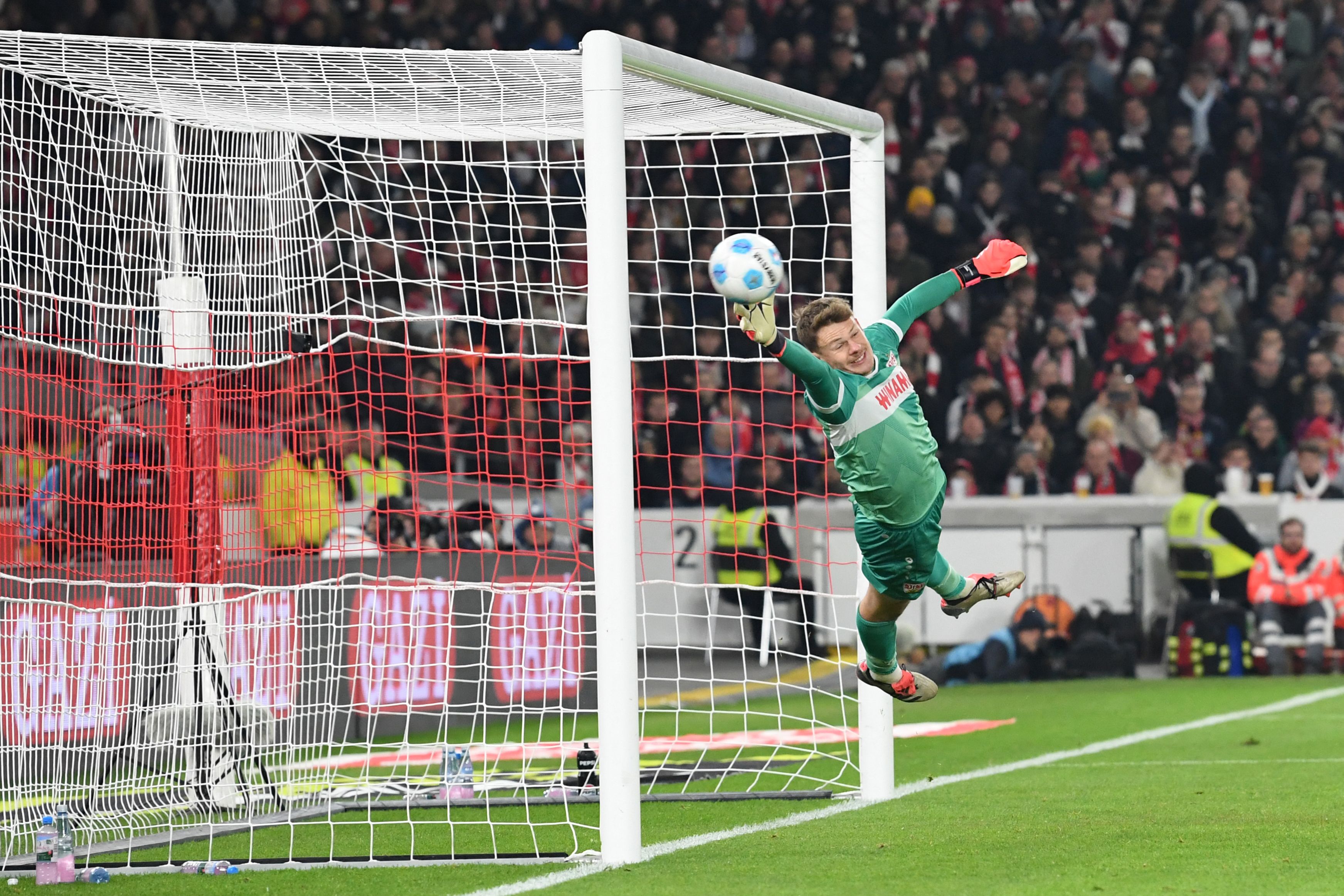 Stuttgart's German goalkeeper #33 Alexander Nuebel reaches but can't stop the ball of the 0-3 goal during the German first division Bundesliga football match VfB Stuttgart vs Eintracht Frankfurt in Stuttgart, southwestern Germany on November 10, 2024. (Photo by Thomas Kienzle/AFP Photo)