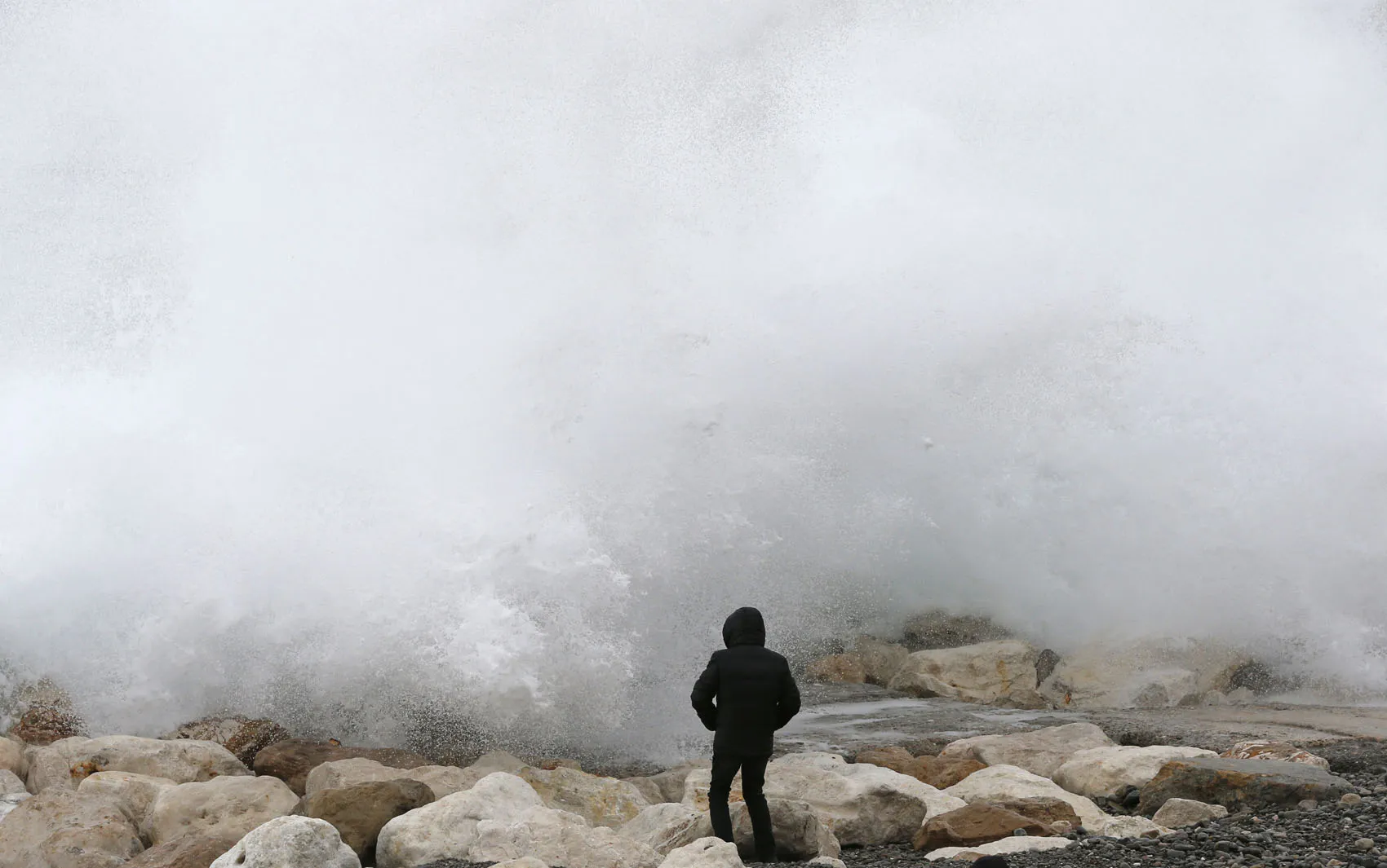 A man looks at waves breaking on the rocks on the beach along the “Promenade des Anglais”, on March 6, 2013 in Nice, southeastern France. (Photo by Valery Hache/AFP Photo)