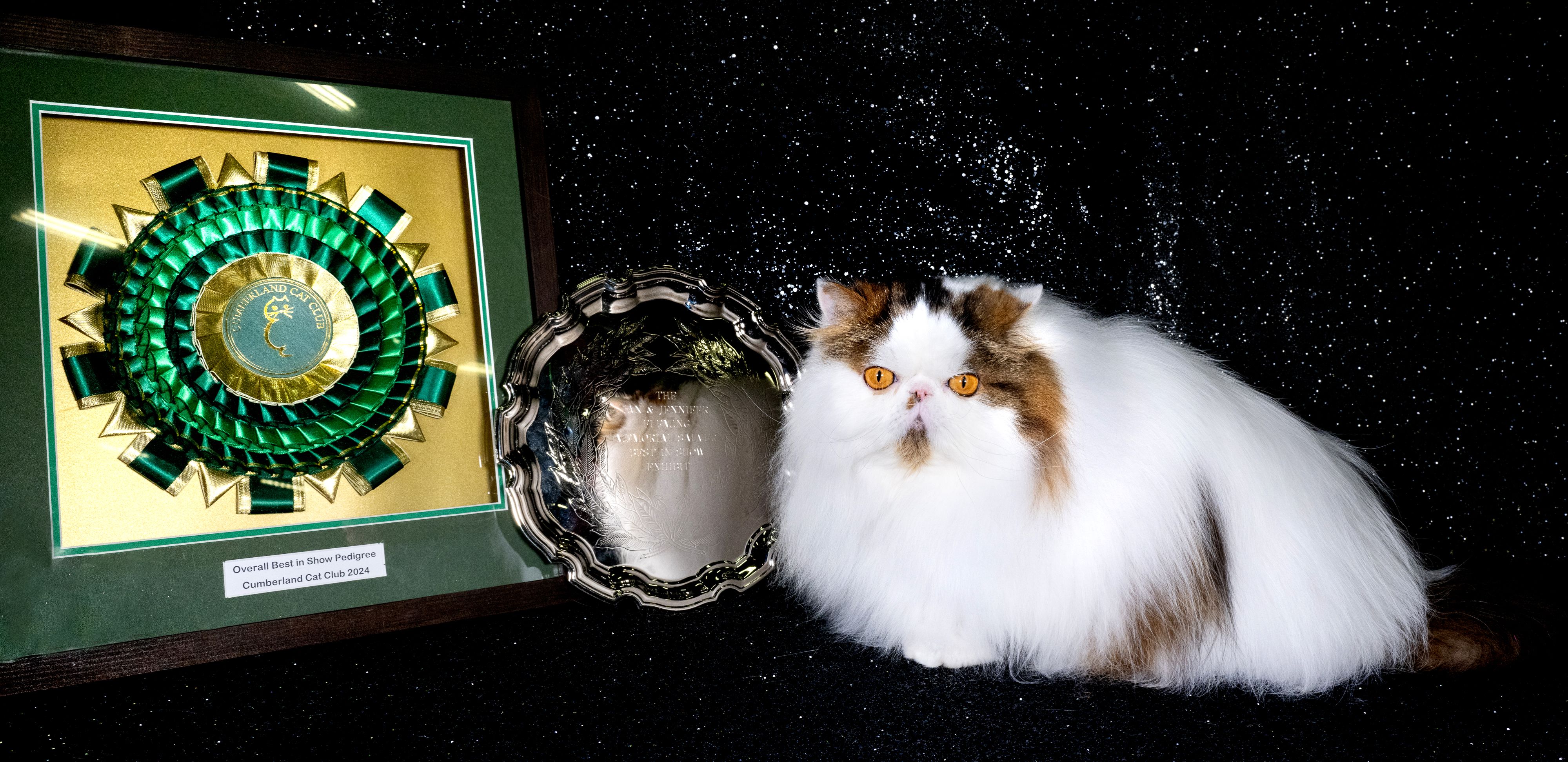 Tickles, a brown tabby with white Persian cat is seen in a studio portrait after winning Best In Show at the Yorkshire and Cumberland cat club championship show at Doncaster Dome on November 09, 2024 in Doncaster, England. (Photo by Shirlaine Forrest/Getty Images)