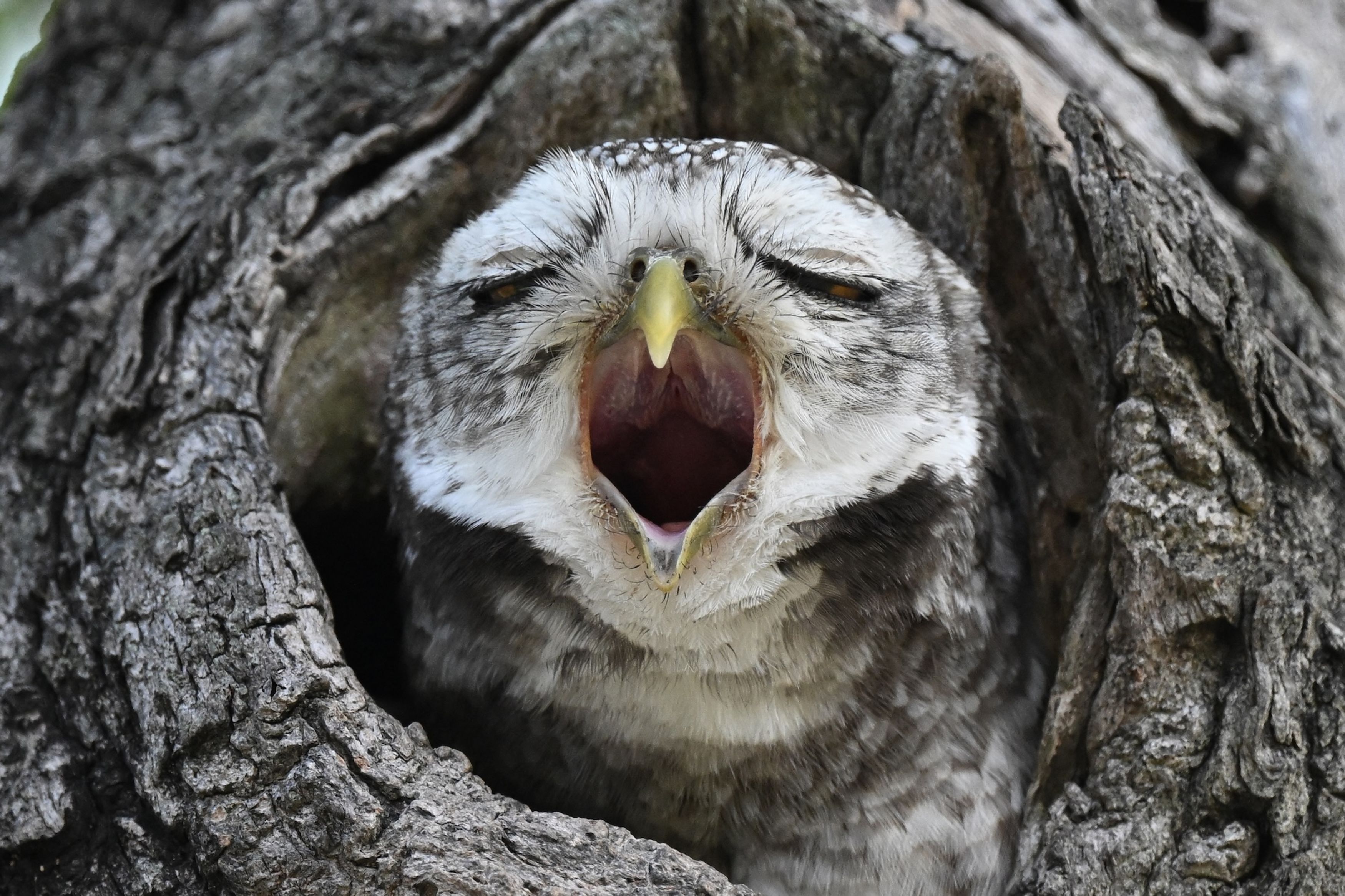 A spotted owlet yawns in a public park in Bangkok on November 11, 2024. (Photo by Lillian Suwanrumpha/AFP Photo)