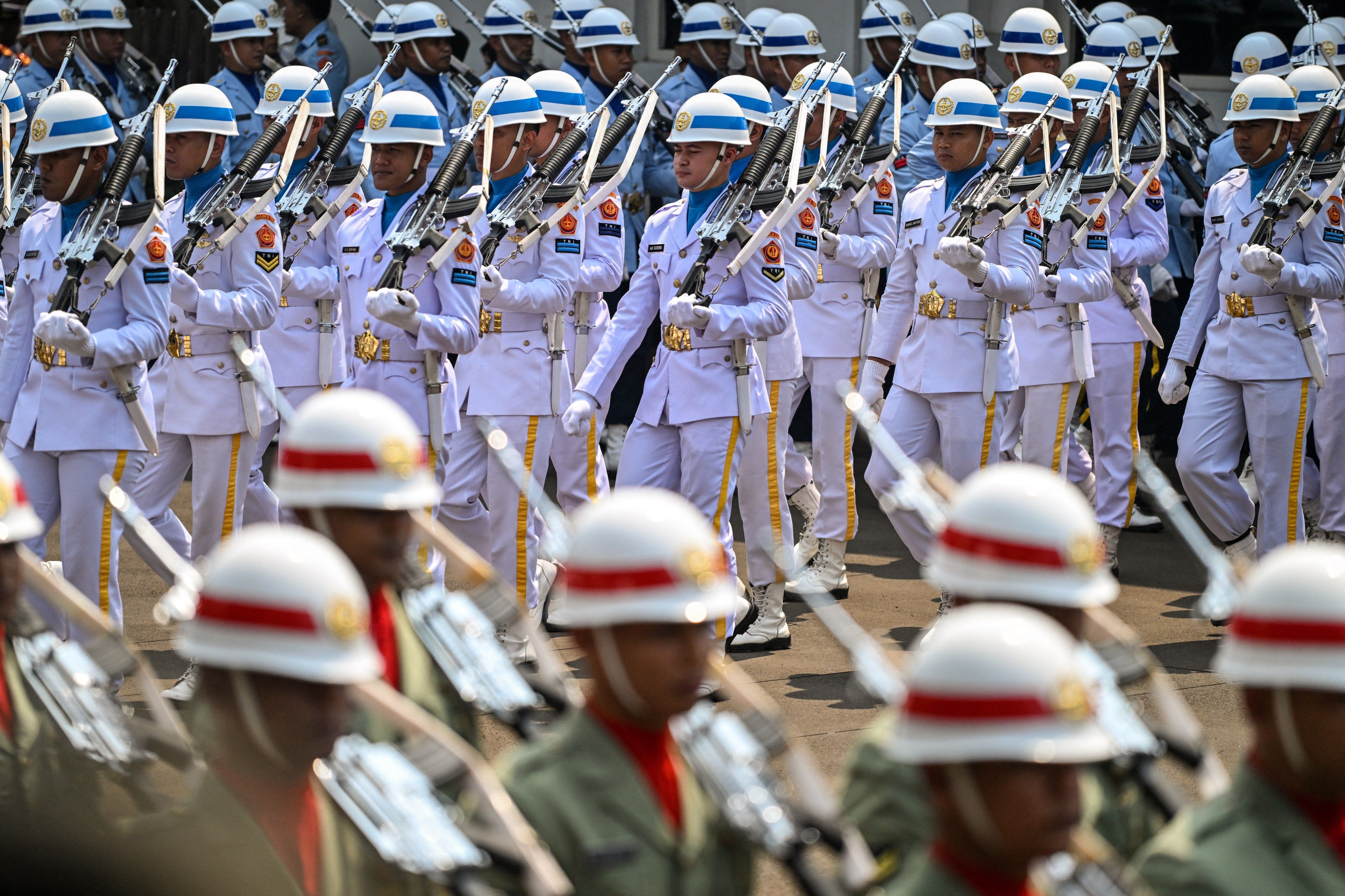 Indonesian troops attend a handover ceremony at the Ministry of Defense in Jakarta on October 22, 2024. (Photo by Juni Kriswanto/AFP Photo)