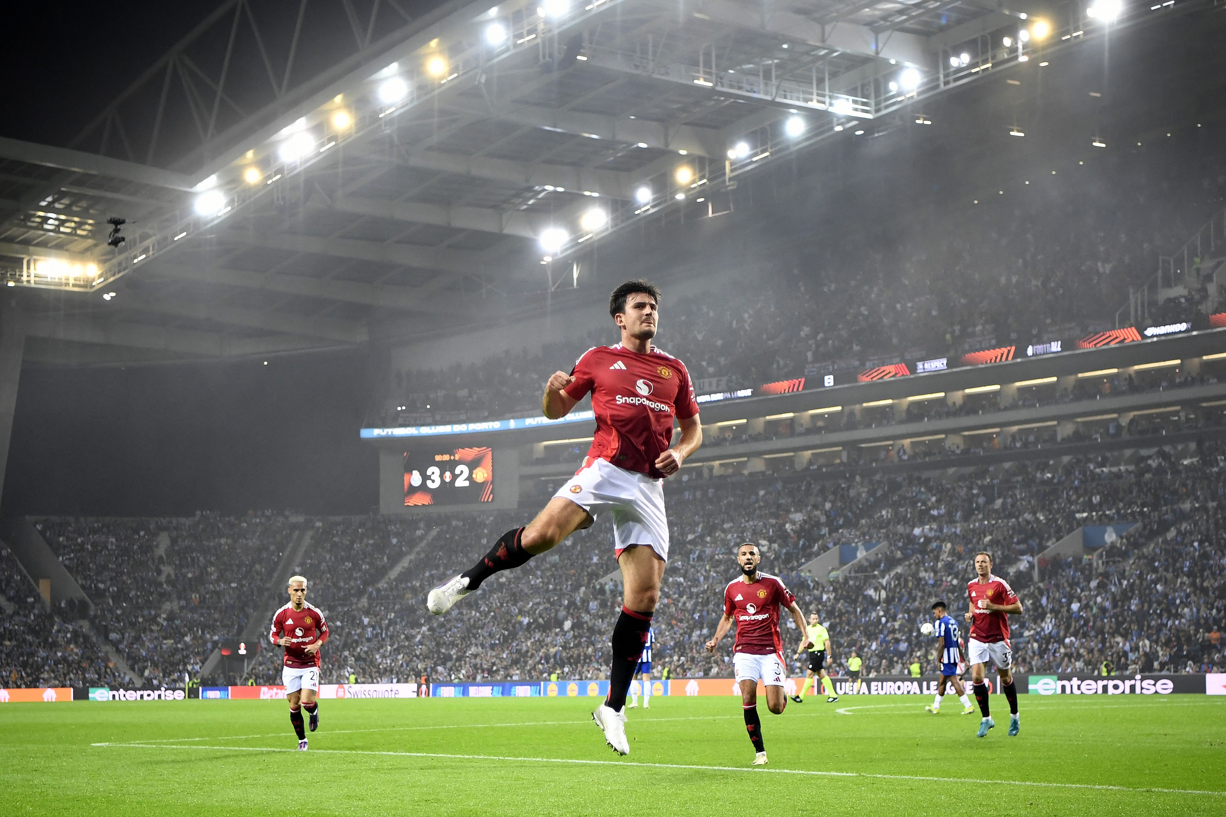 Manchester United's English defender #05 Harry Maguire celebrates scoring his team's third goal during the UEFA Europa League 1st round day 2 between FC Porto and Manchester United at the Dragao stadium in Porto on October 3, 2024. (Photo by Miguel Riopa/AFP Photo)