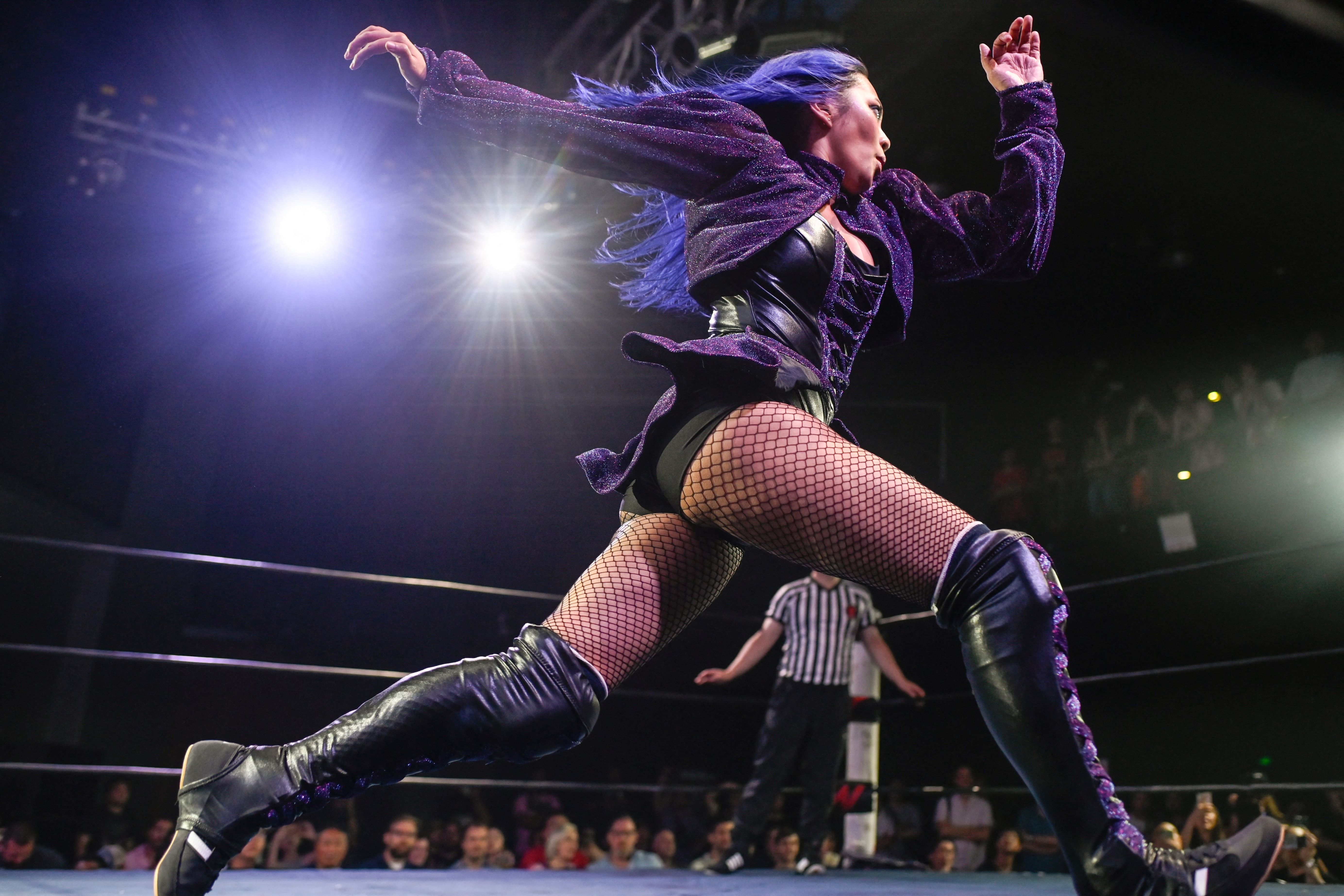 This picture taken on September 14, 2024 shows Filipina wrestler “Crystal” fighting her opponent Yuki Kamifuku of Japan (not pictured) during a Middle Kingdom Wrestling (MKW) championship event in Shanghai. Despite a promising potential domestic market, the Chinese pro wrestling community has been battling for recognition and financial stability for decades. (Photo by Wang Zhao/AFP Photo)