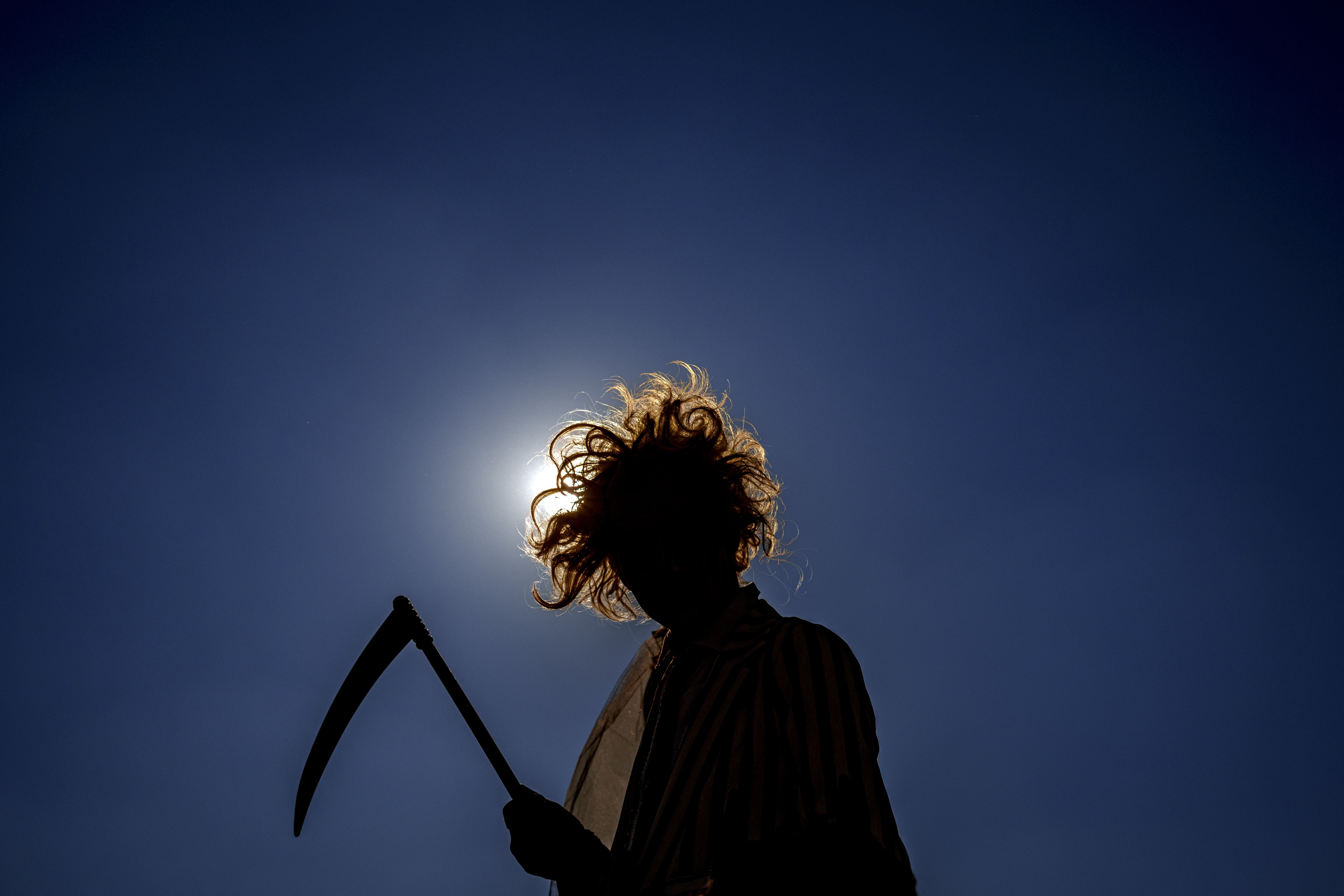 A man wearing a costume and holding a mock scythe, is silhouetted against the sky at the West Side Hallo Fest, a Halloween festival in Bucharest, Romania, Saturday, October 26, 2024. (Photo by Andreea Alexandru/AP Photo)
