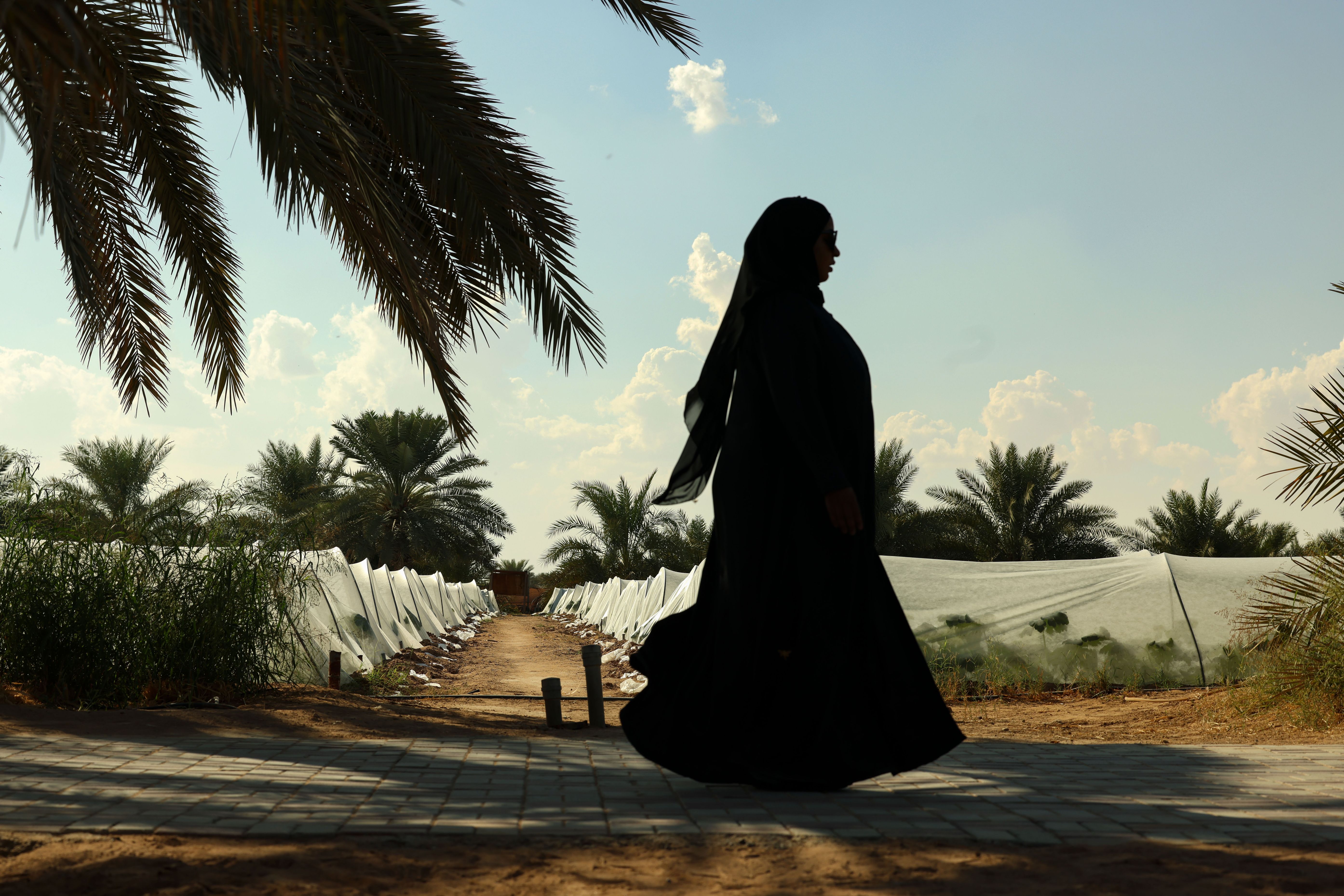 UAE climate minister Dr. Amna bint Abdullah Al Dahak (not picttured) visits an Emirati farm on June 11, 2024 as part of the Plant the Emirates initiative. She is accompaned by farm owner Abdul Rahman Rashid Al Shamsi. Al Ain. (Photo by Chris Whiteoak/The National)