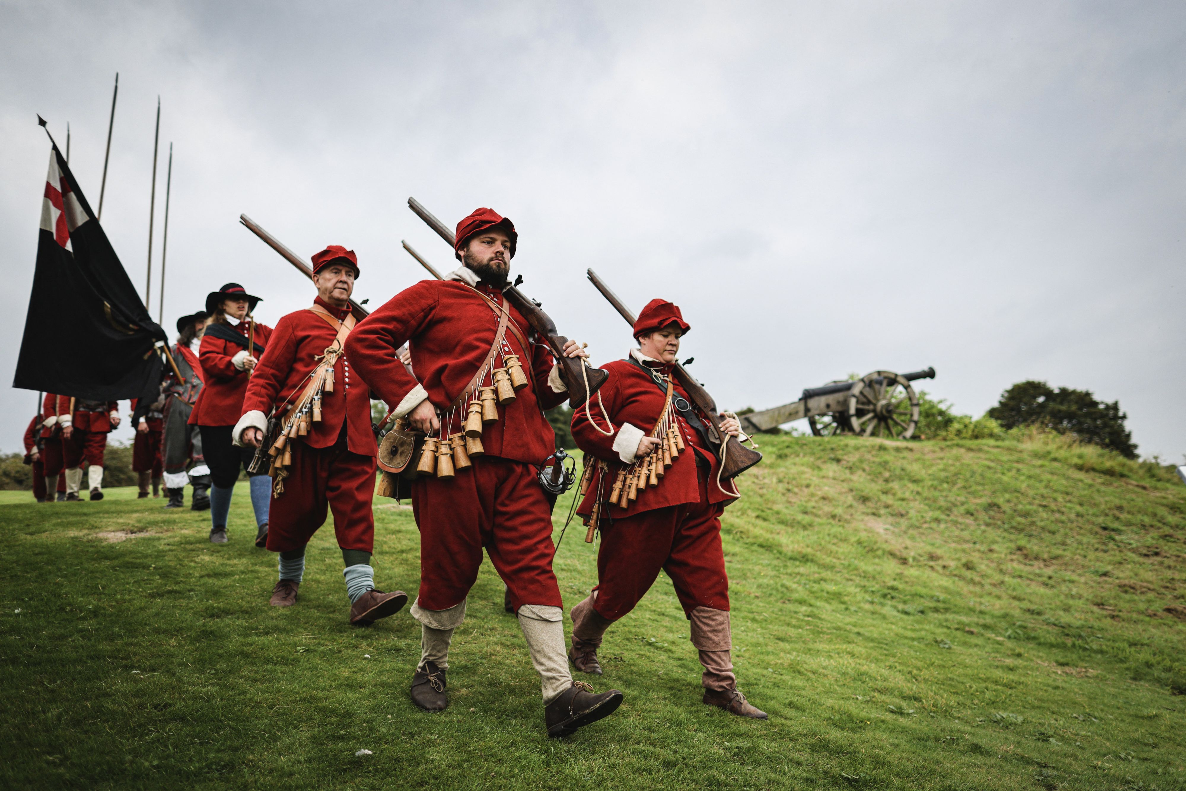 Members of The Marquis of Winchester Regiment march from the battlefield following a battle while taking part in a re-enactment of the 1645 English Civil War, at Old Basing House near Basingstoke south east England, on September 17, 2023. After the decisive defeat of King Charles I's army at Naseby in Northamptonshire in June 1645 Oliver Cromwell led part of the New Model Army to "mop up" remaining royalist bases in Wiltshire and Hampshire. He appeared before Basing House around 8 October, determined to capture this major royalist stronghold, containing both a garrison and civilians, including many Catholics, which had resisted earlier sieges and had long been a thorn in parliament's side. He subjected the place to heavy bombardment and by the 13 had opened up breaches in the defences. He and his men stormed and captured the stronghold on the morning of 14 October. (Photo by Adrian Dennis/AFP Photo)
