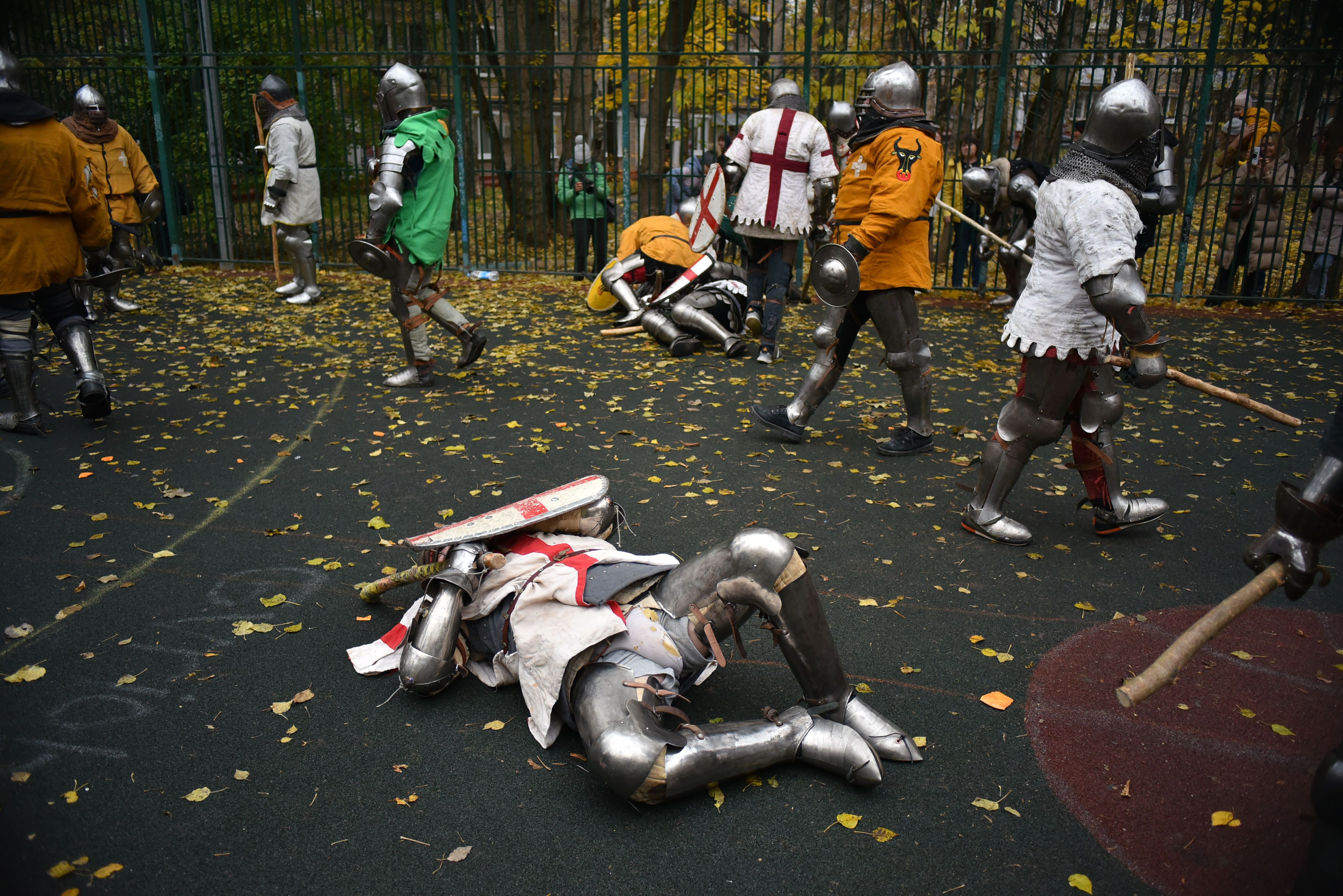 People wearing medieval armour components take part in a friendly fight event held in a basketball court to keep the medieval street fights alive in Russian capital Moscow on October 28, 2024. (Photo by Stringer/Anadolu via Getty Images)
