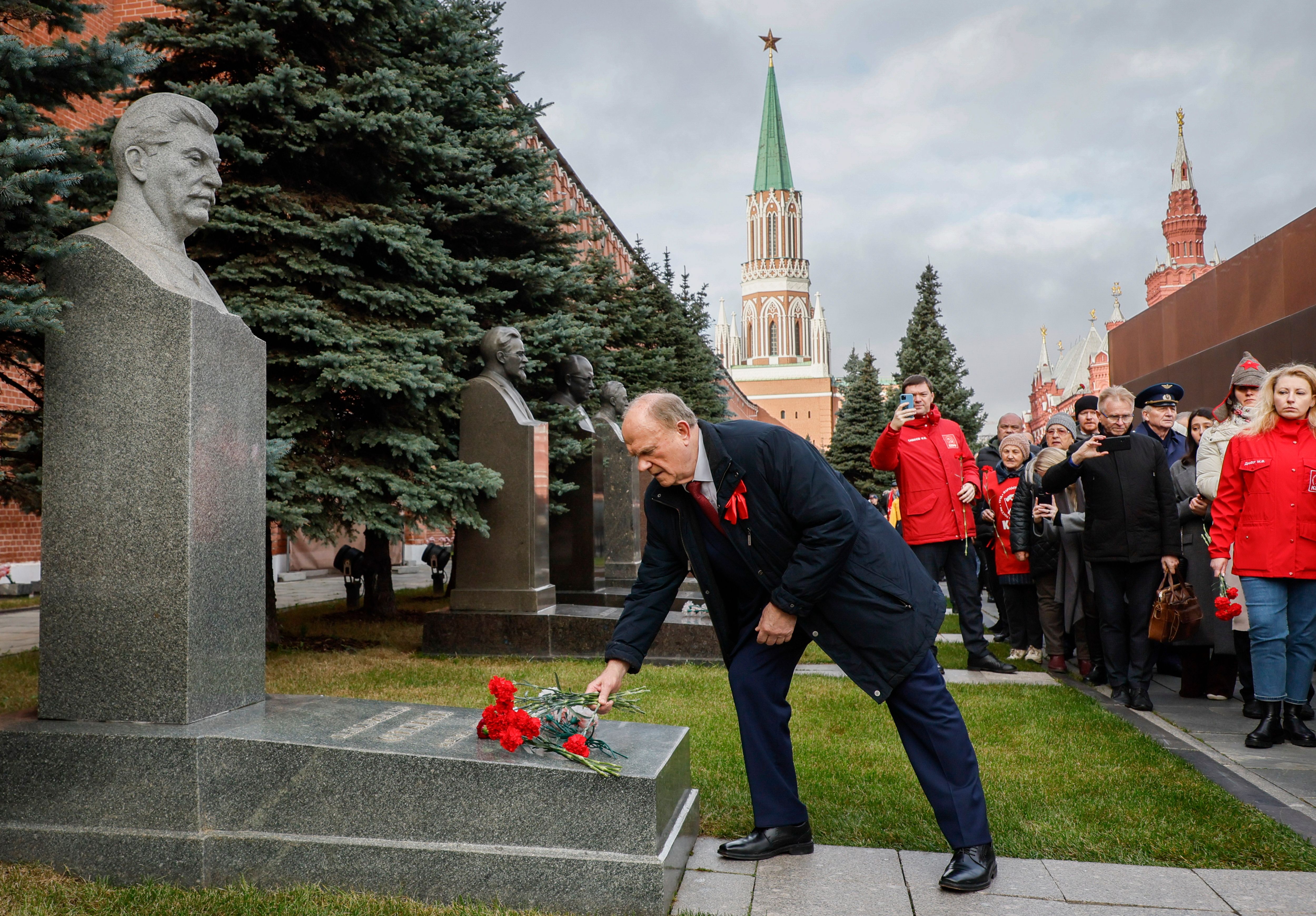 Leader of the Russian Communist Party, Gennady Zuganov, attends a laying flowers ceremony at Joseph Stalin's tomb on the Red Square to mark the 106th anniversary of the founding of the Leninist Komsomol in Moscow, Russia, 29 October 2024. The Komsomol is a political youth organization of the Soviet Union. (Photo by Yuri Kochetkov/EPA/EFE)