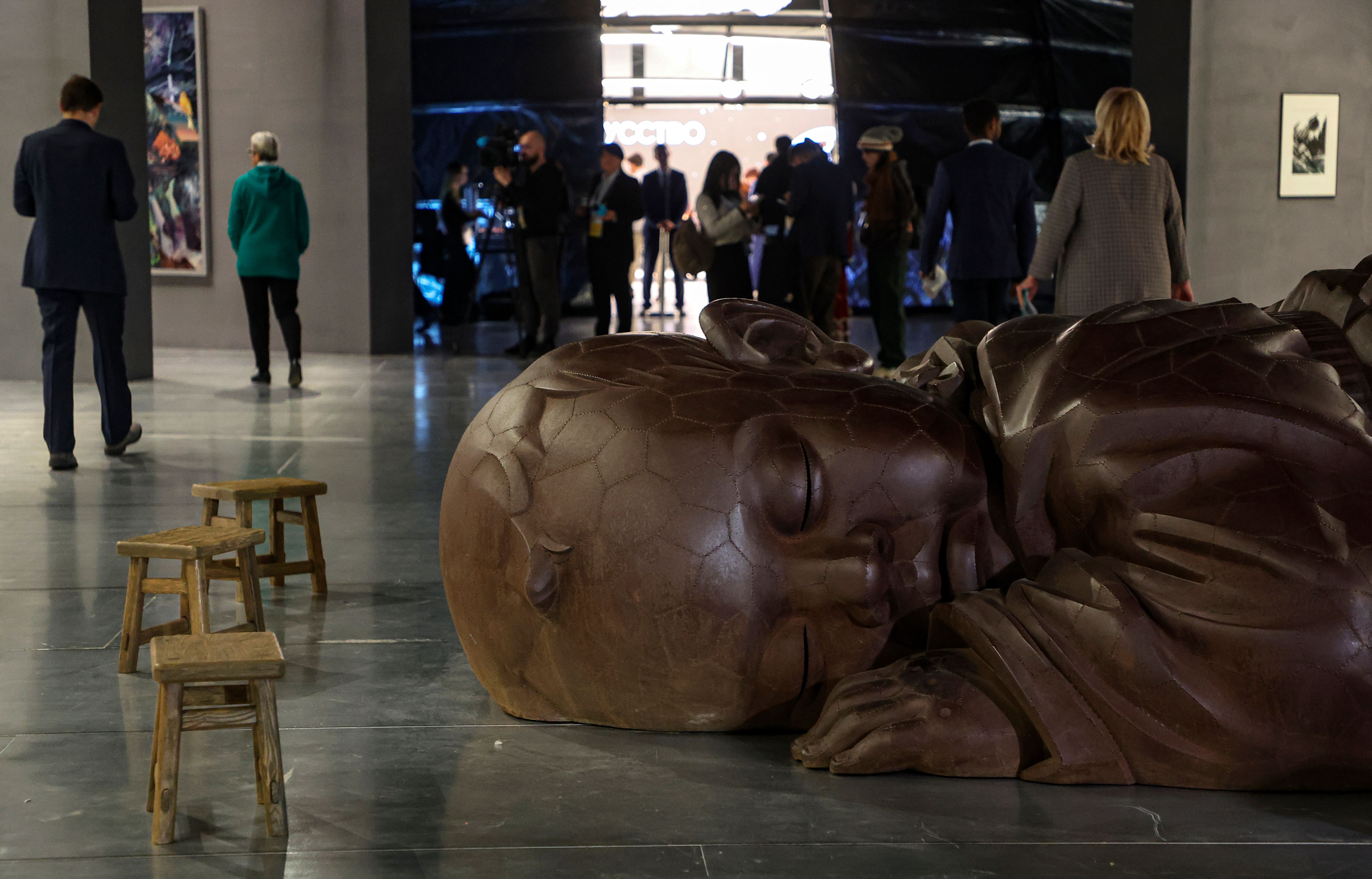 Visitors pass a miniature copy of the sculpture of a huge sleeping baby “Child of the Earth” by a member of the Chinese Sculptors' Union and the Chinese Society of Arts and Crafts Dong Shubin during the International Science Fiction symposium “Inventing the Future” at the National Centre Russia in Moscow, Russia, 04 November 2024. The Russia National Centre hosts the International Science Fiction Symposium “Inventing the Future” from 04 to 06 November. (Photo by Sergei Ilnitsky/EPA/EFE)