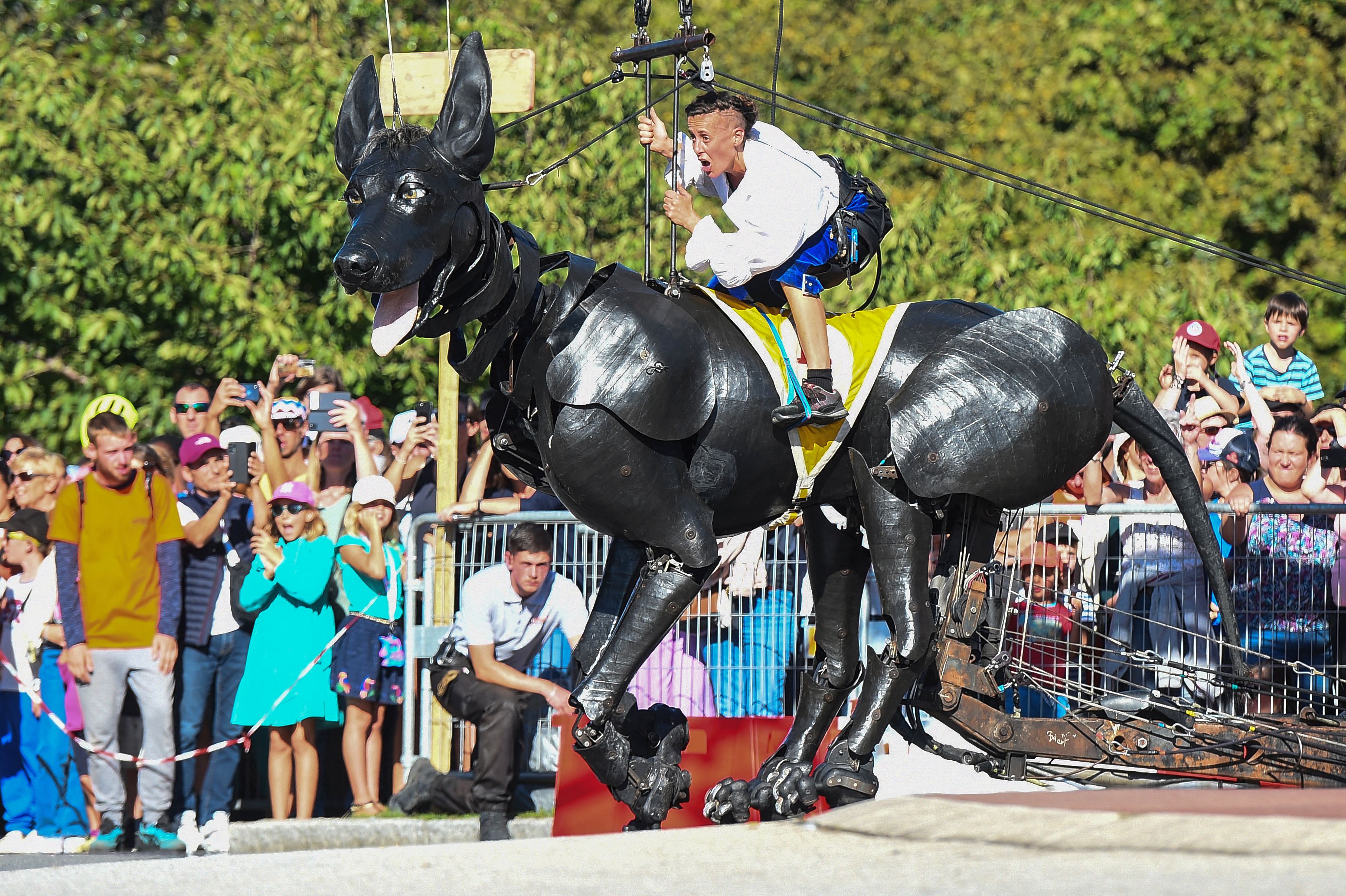 Members of the French street theatre company “Royal de Luxe” perform on Xolo, a giant dog puppet during the show “Le Bull Machin de Mr Bourgogne” in Nantes, on September 24, 2023. (Photo by Sebastien Salom-Gomis/AFP Photo)