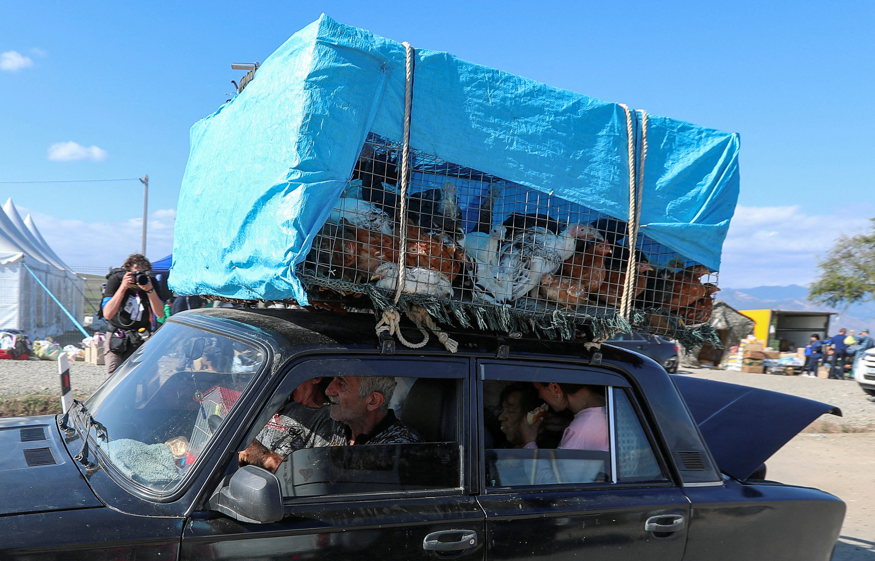 Refugees from Nagorno-Karabakh region ride in a car transporting chickens upon their arrival in the border village of Kornidzor, Armenia on September 27, 2023. (Photo by Irakli Gedenidze/Reuters)