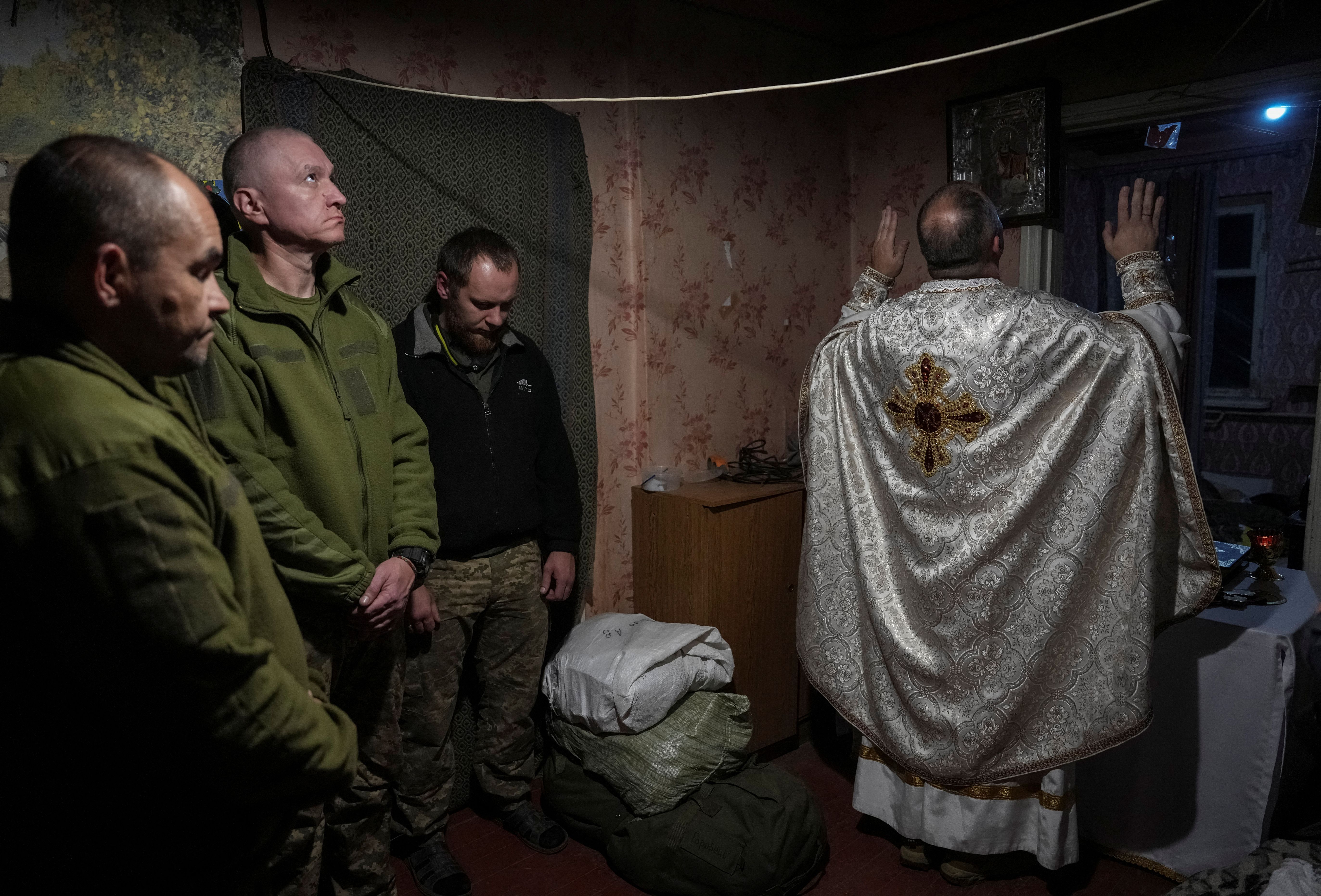 A military chaplain Yuriy conducts an Orthodox service for new recruits of the 24th Separate Mechanized Brigade of the Ukrainian Armed Forces, named after King Danylo, before their first combat mission, amid Russia's attack on Ukraine, near the town of Chasiv Yar in Donetsk region, Ukraine on November 3, 2024. (Photo by Inna Varenytsia/Reuters)