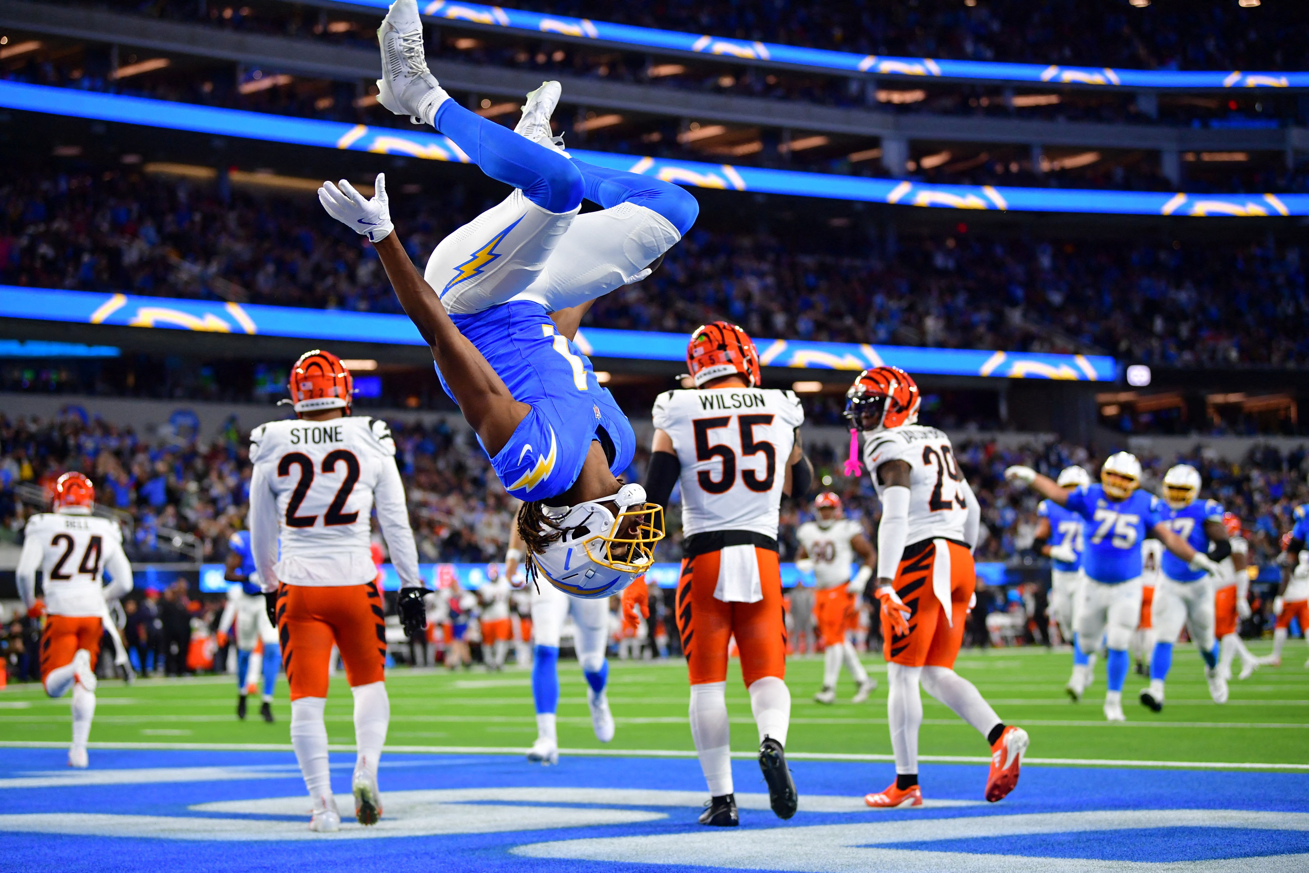 Los Angeles Chargers wide receiver Quentin Johnston celebrates his touchdown against the Cincinnati Bengals at SoFi Stadium in Inglewood, California on November 18, 2024. (Photo by A. Vasquez/Imagn Images via USA TODAY Sports)