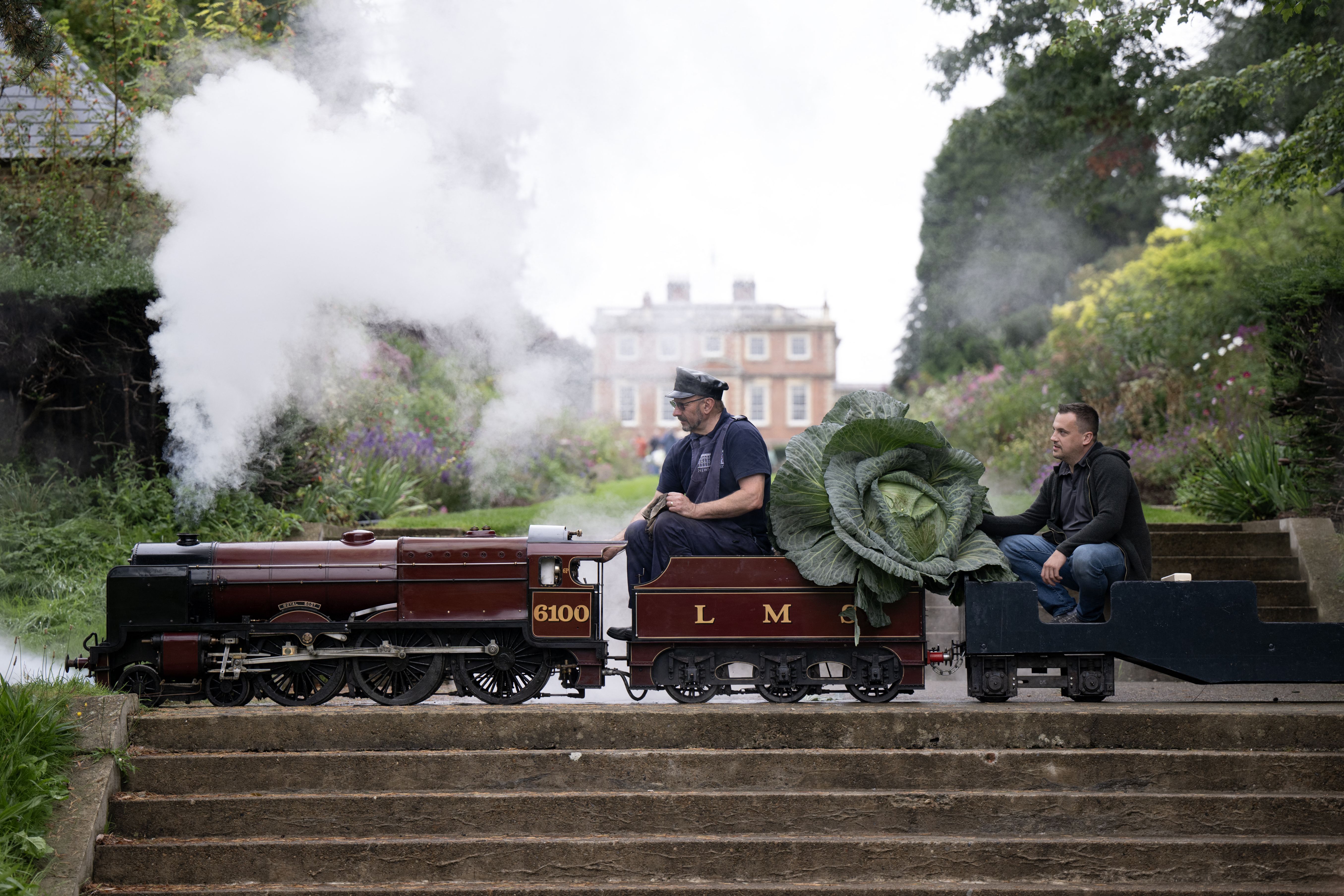 Steam engine driver Bob Corrie (L) and grower Paul Proud pose for a photograph with Paul's huge cabbage that won its category in the giant vegetable competition on the first day of the Harrogate Autumn Flower Show held at Newby Hall country house, near Ripon, northern England, on September 15, 2023. (Photo by Oli Scarff/AFP Photo)