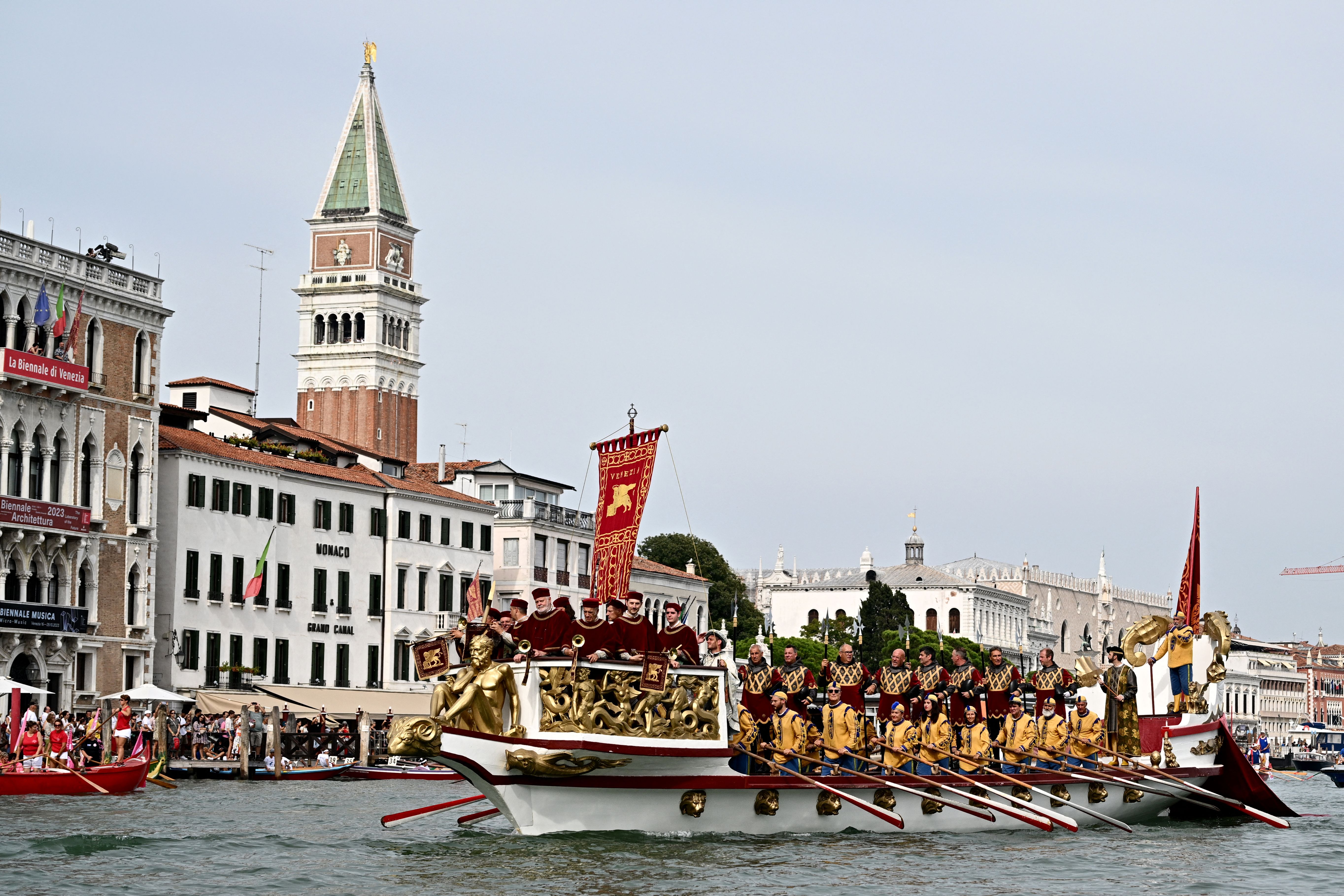 Rowers take part in the annual gondolas and boats Historical Regatta (Regata Storica) on the Grand Canal, close to Rialto bridge in Venice on September 3, 2023. (Photo by GAbriel Bouys/AFP Photo)