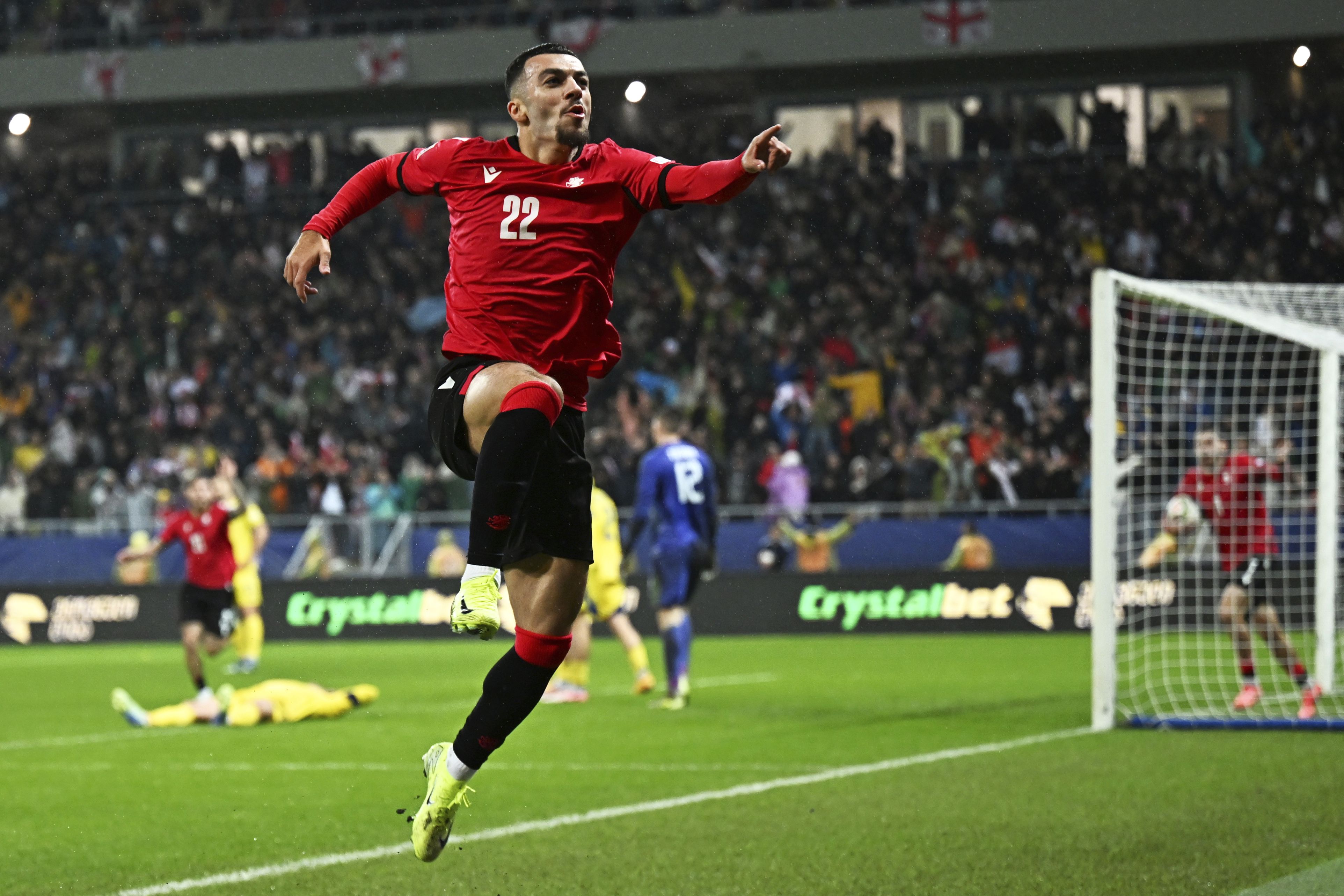 Georgia's Georges Mikautadze celebrates after scoring his side's first goal during the UEFA Nations League, group B1 soccer match between Georgia and Ukraine at the AdjaraBet Arena in Batumi, Georgia, Saturday, November 16, 2024. (Photo by Tamuna Kulumbegashvili/AP Photo)
