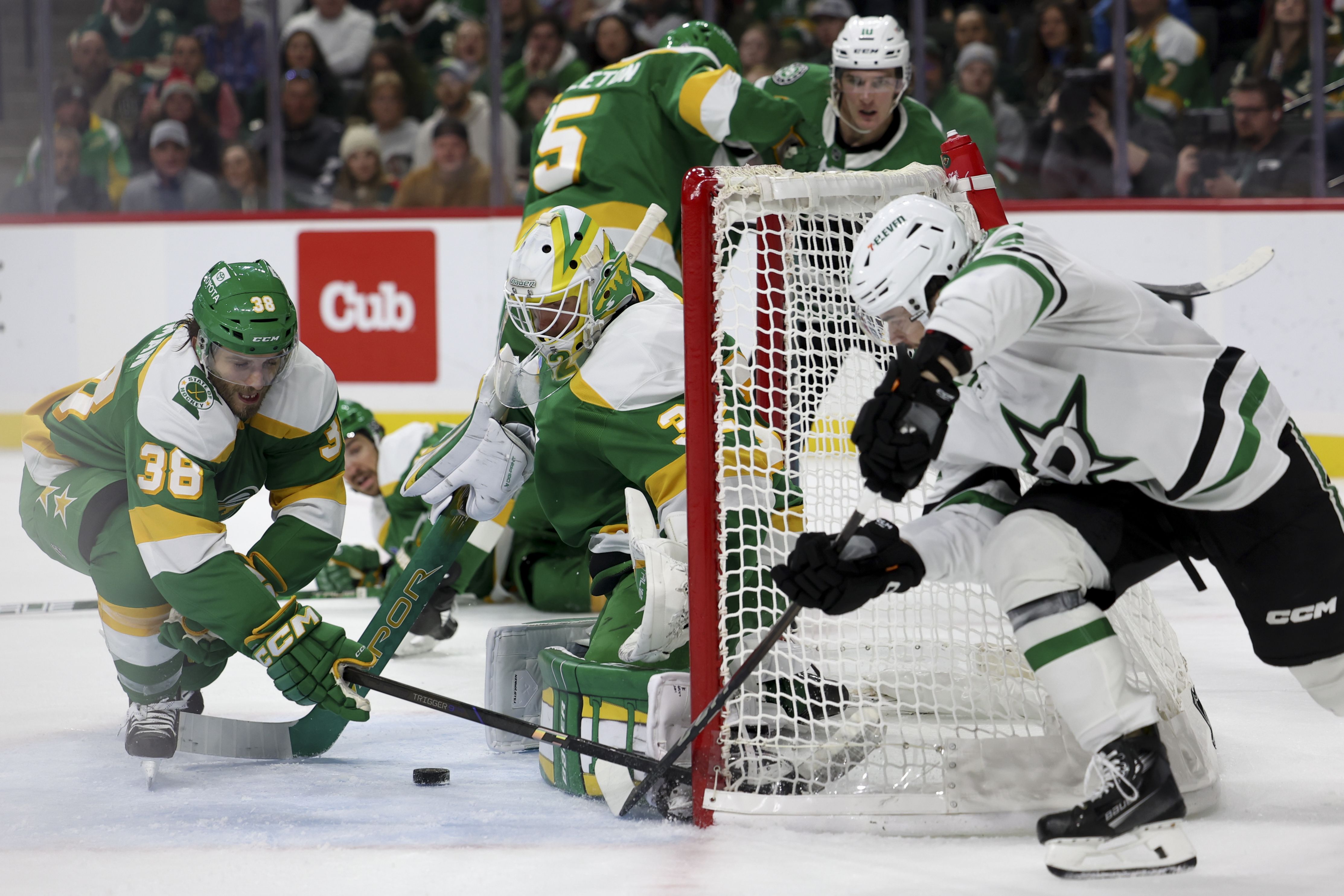 Dallas Stars center Mavrik Bourque, right, attempts to score while Minnesota Wild right wing Ryan Hartman (38) and Wild goaltender Filip Gustavsson (32) keep the puck out of the net during the second period of an NHL hockey game, Saturday, November 16, 2024, in St. Paul, Minn. (Photo by Ellen Schmidt/AP Photo)
