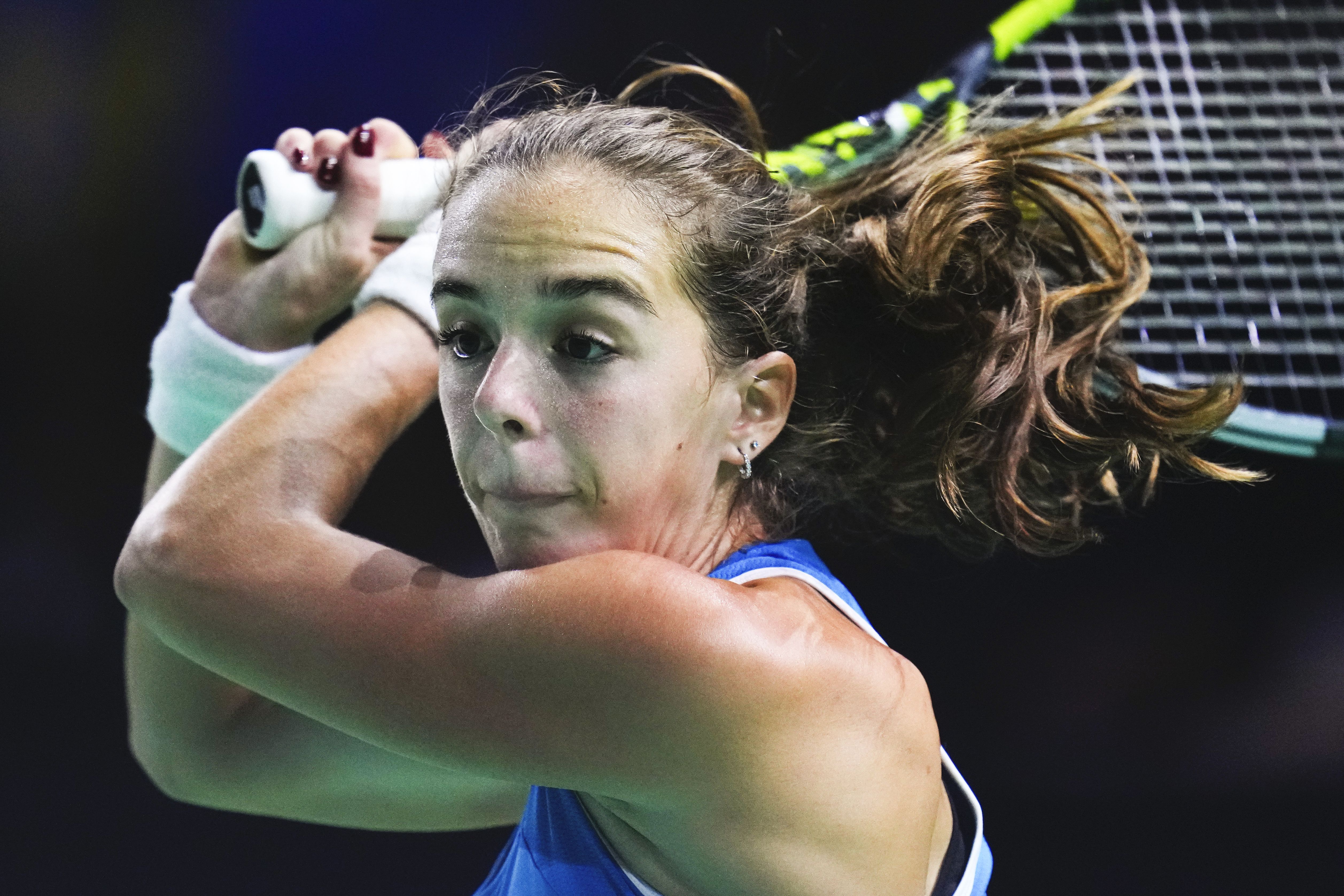 Italy's Lucia Bronzetti competes against Slovakia's Viktoria Hruncakova during the Billie Jean King Cup final at the Martin Carpena Sports Hall in Malaga, southern Spain, Wednesday, November 20, 2024. (Photo by Manu Fernandez/AP Photo)