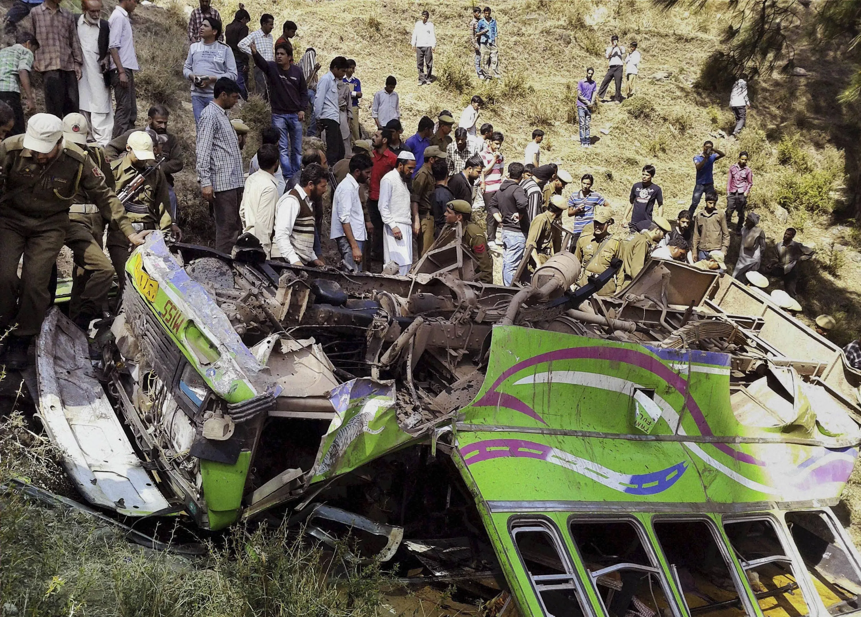 Indian people and policemen, in uniform, gather after a bus accident at Rajouri district in Jammu, India, Friday, March 8, 2013. Fifteen people were killed and 24 injured when a bus rolled down into a deep gorge, according to local reports. (Photo by AP Photo)