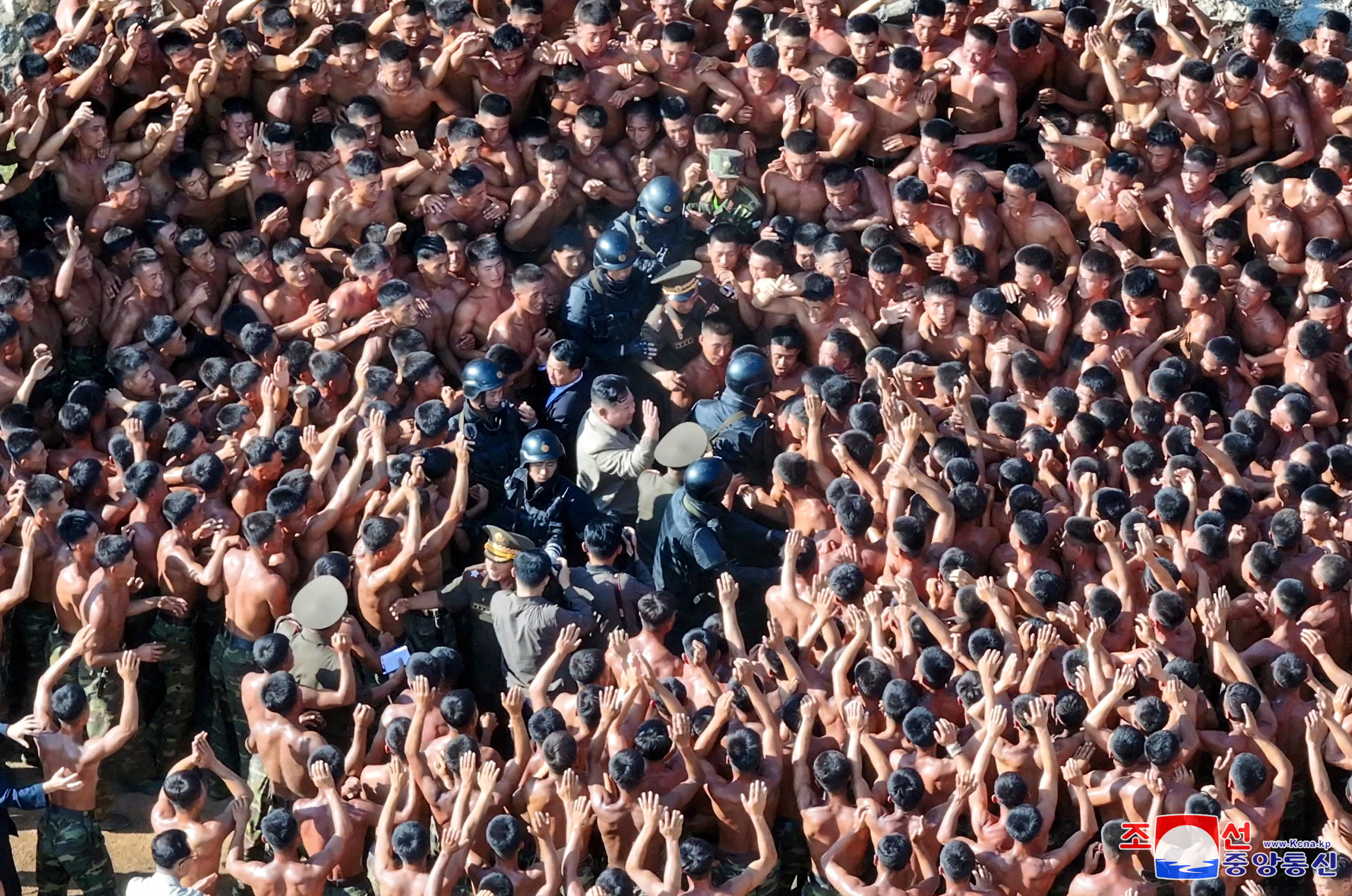 President Kim Jong-un is surrounded by cadets at a military training base at an undisclosed location in North Korea on September 11, 2024. (Photo by KCNA via KNS/AFP Photo)