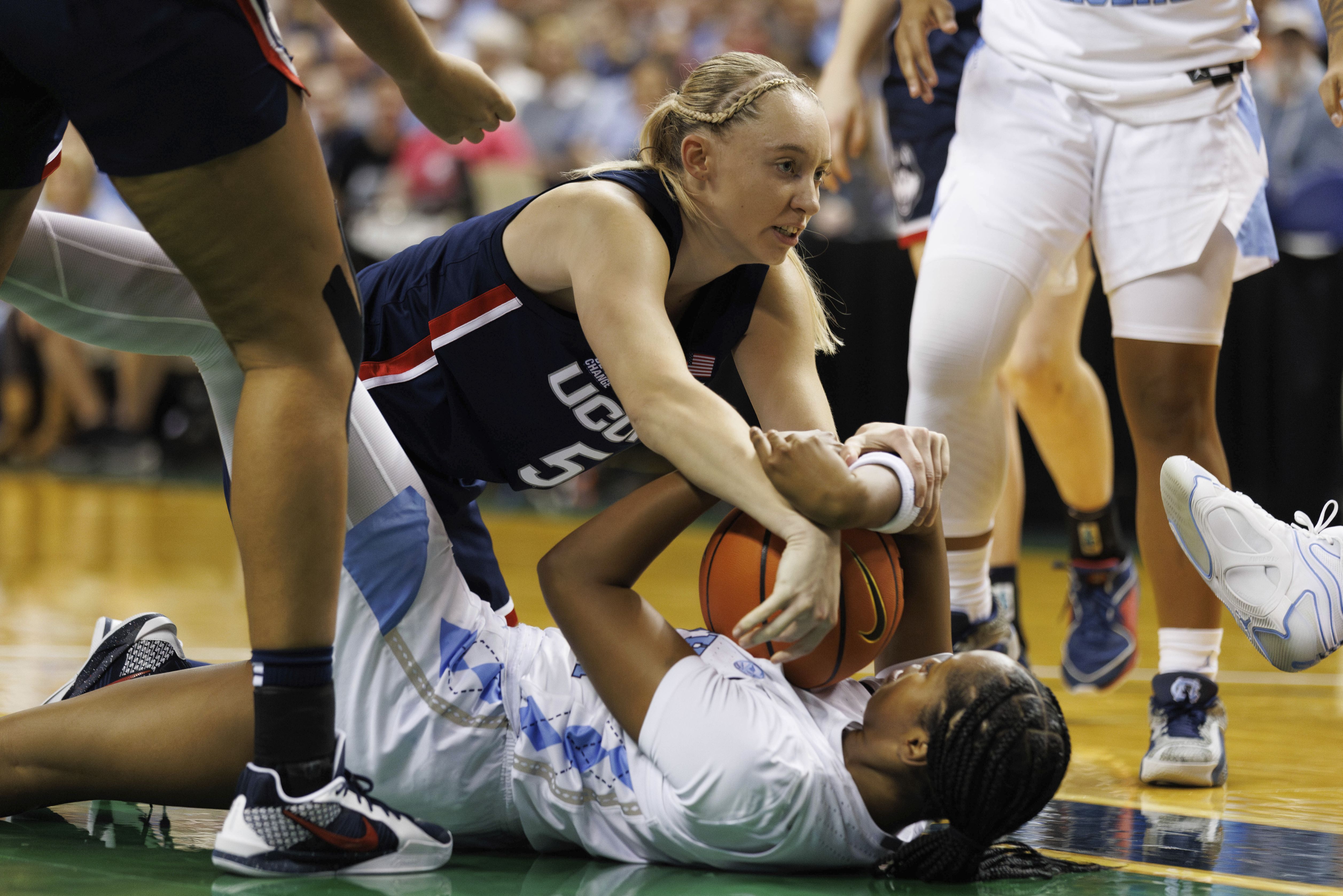 UConn's Paige Bueckers (5) battles North Carolina's Laila Hull, right, for a loose ball during the second half of an NCAA college basketball game in Greensboro, N.C., Friday, November 15, 2024. (Photo by Ben McKeown/AP Photo)