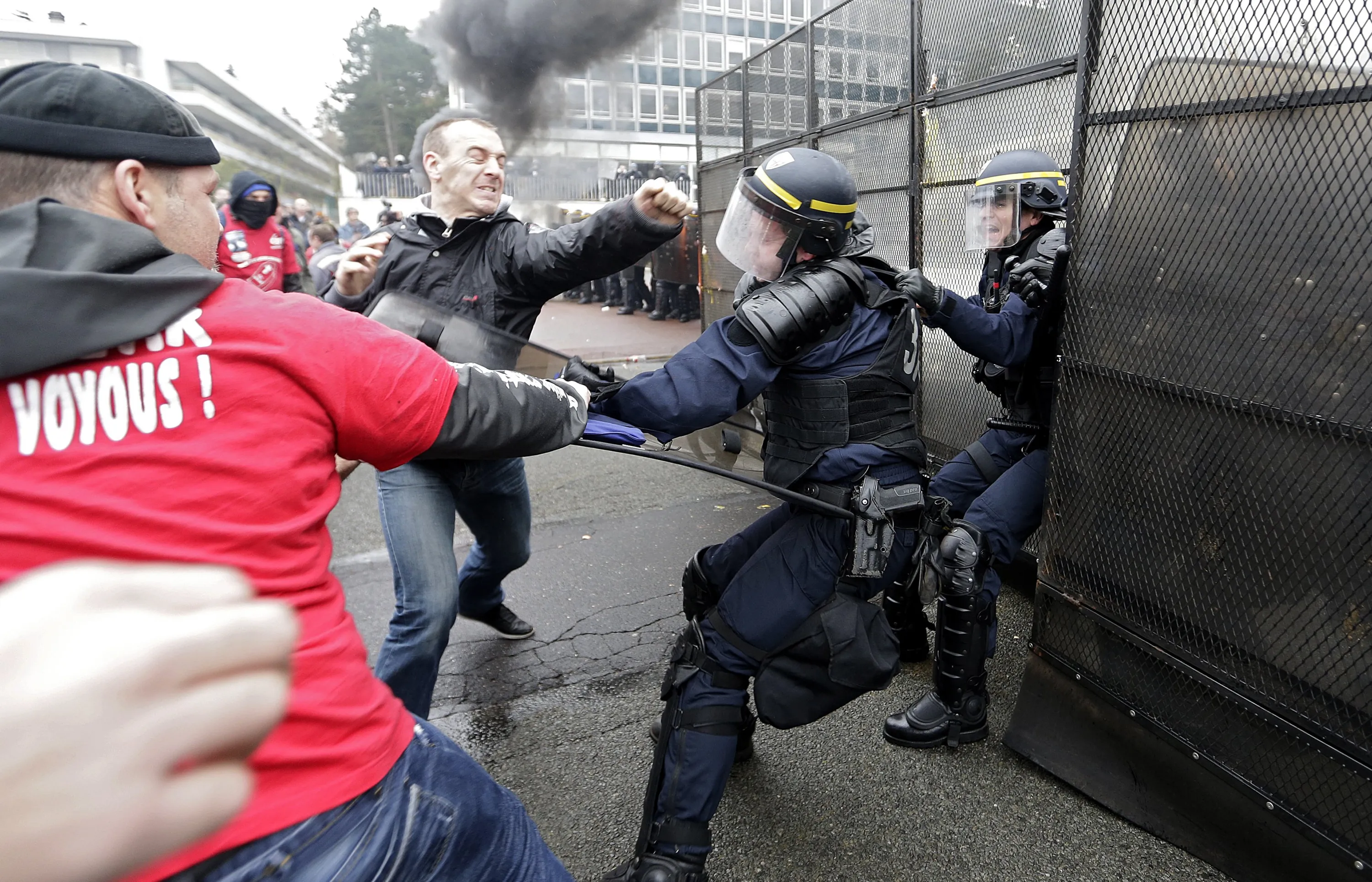 Protesters scuffle with French riot police in front of the headquarters of tire maker Goodyear Dunlop France during a demonstration against job cuts March 7, 2013 near Paris. In January, Goodyear confirmed plans to close a French plant near the northern city of Amiens, which would cut 1,173 jobs. (Photo by Jacky Naegelen/Reuters)