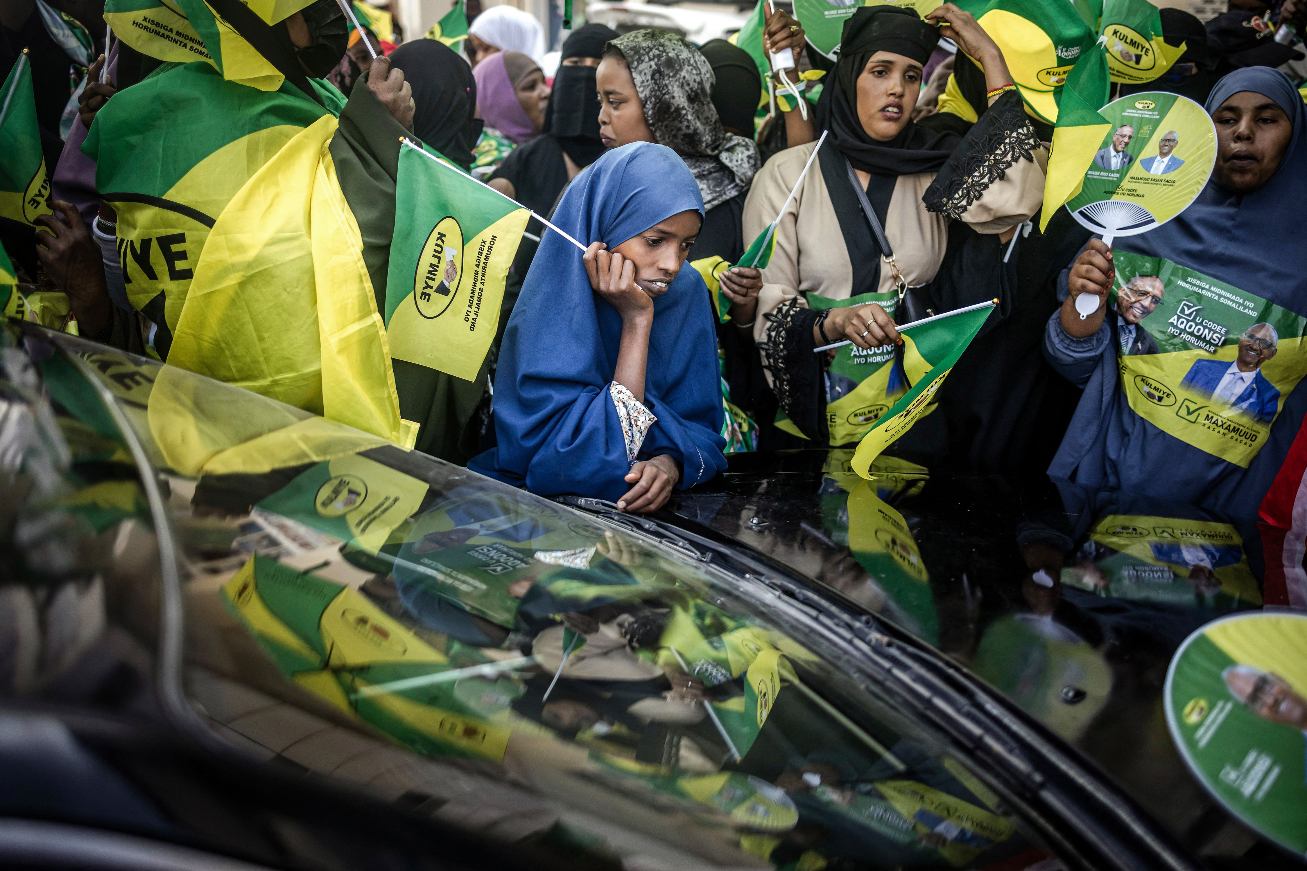 A girl holds a flag as supporters of the ruling Kulmiye party gather to dance and chant party slogans following a final campaign rally in Hargeisa on November 9, 2024, ahead of the 2024 Somaliland presidential election. The self-declared state of Somaliland is set to host a long-delayed presidential and legislative elections in November 13, 2024. (Photo by Luis Tato/AFP Photo)