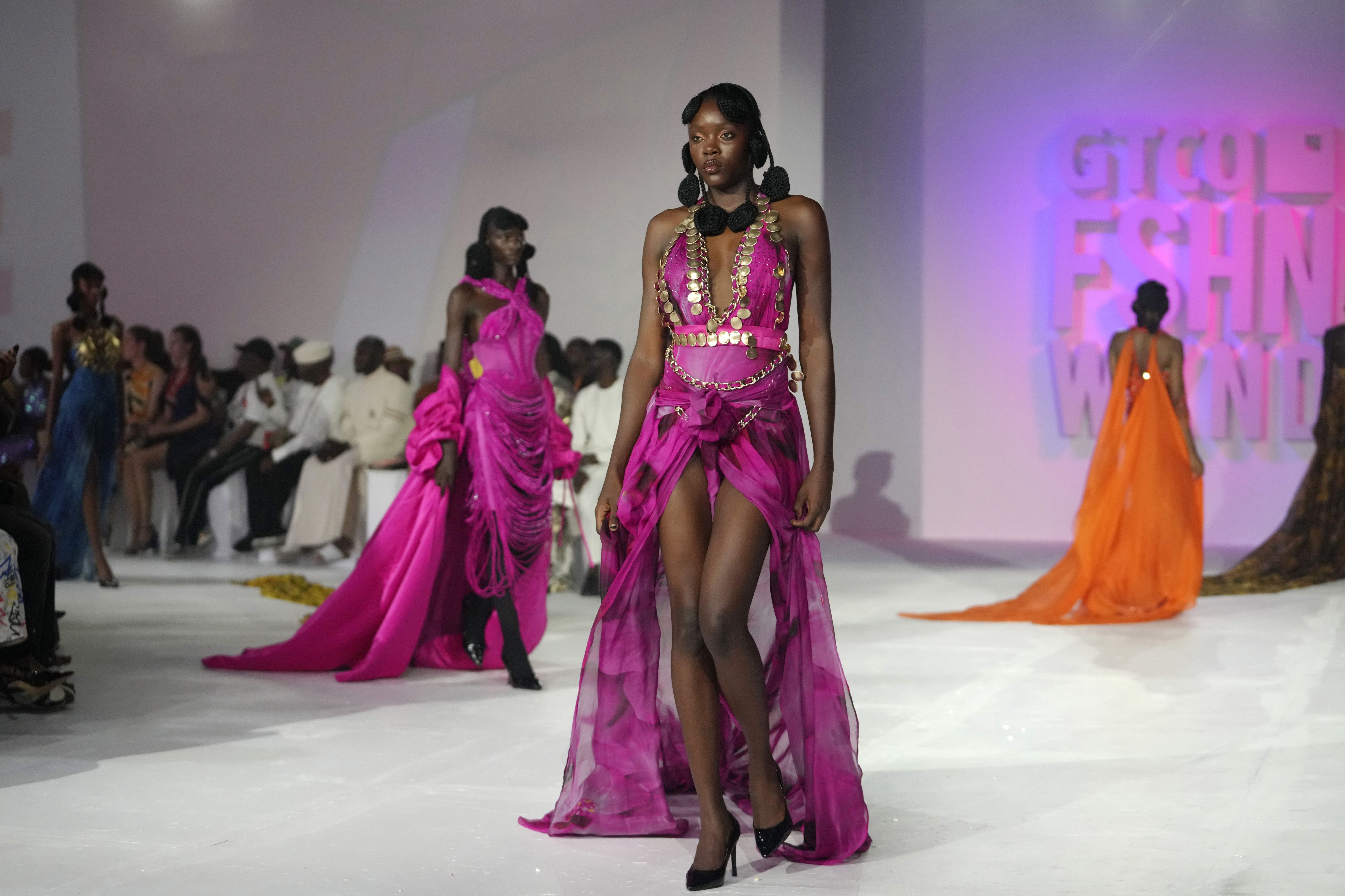 Models wear a creation by designer Gert-Johan during the GTCO Fashion Weekend in Lagos, Nigeria, Saturday, November 9, 2024. (Phoot by Sunday Alamba/AP Photo)