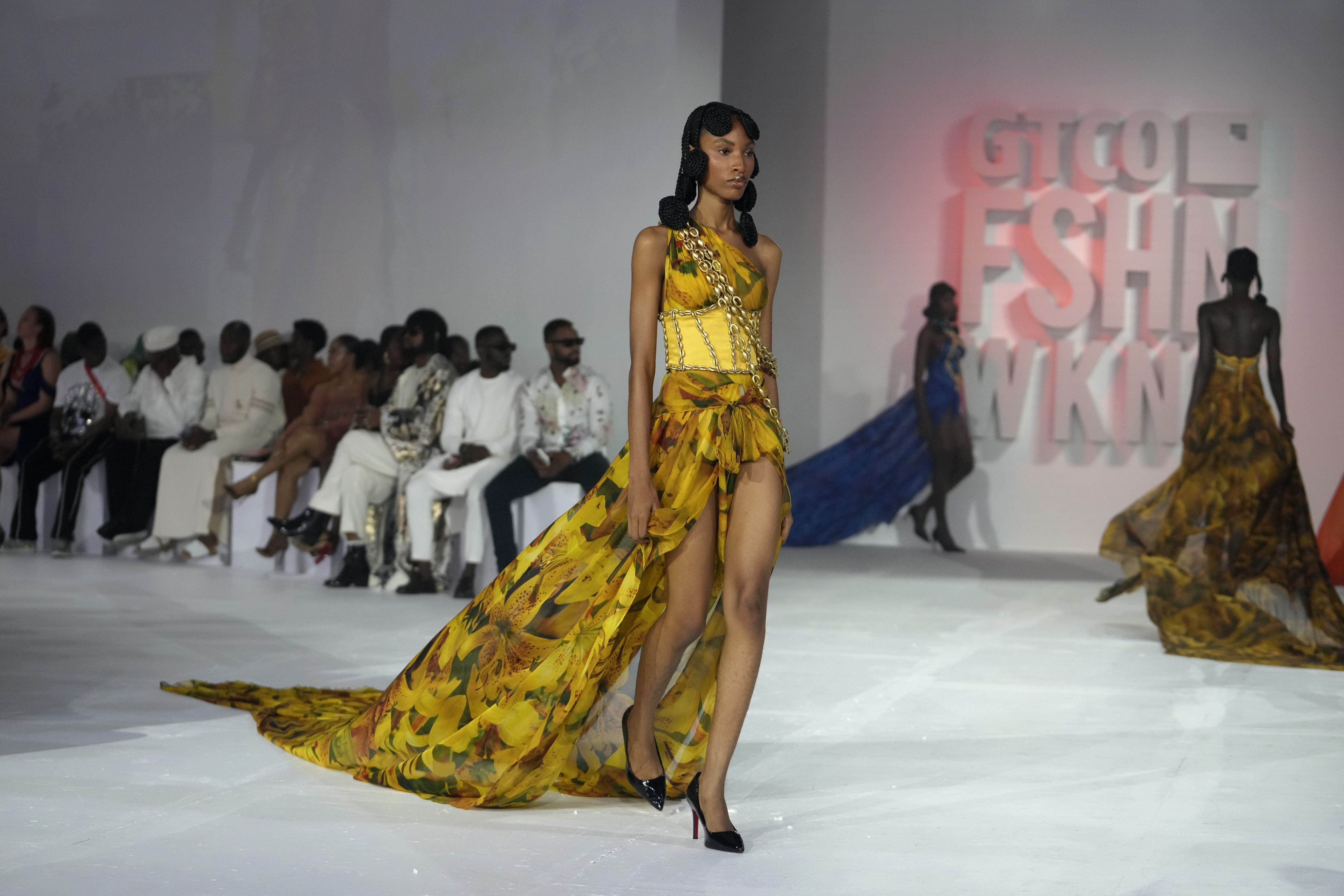 A model wears a creation by designer Gert-Johan during the GTCO Fashion Weekend in Lagos, Nigeria, Saturday, November 9, 2024. (Phoot by Sunday Alamba/AP Photo)