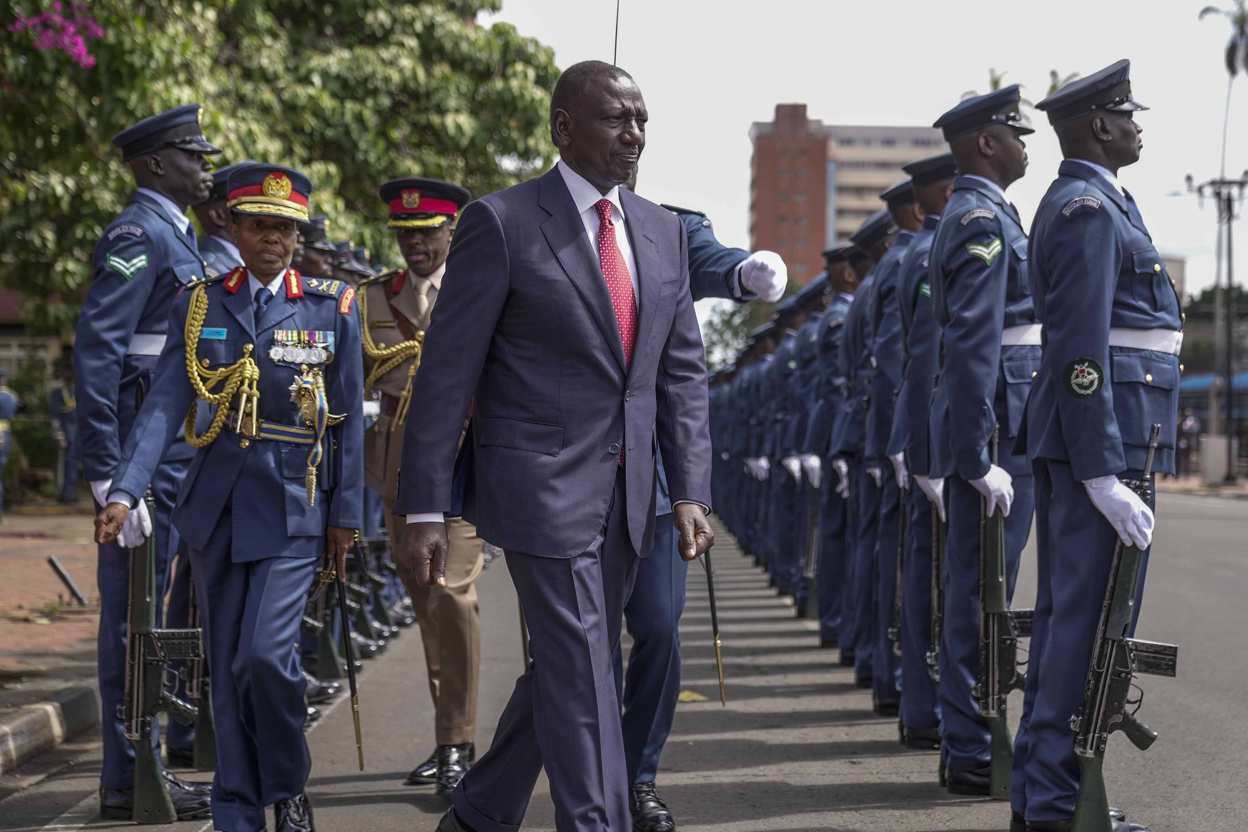 Kenyan President William Ruto, center, reviews the honour guard after arriving to give the State of The Nation address at Parliament buildings in Nairobi, Kenya, Thursday, November 21, 2024. (Photo by Brian Inganga/AP Photo)