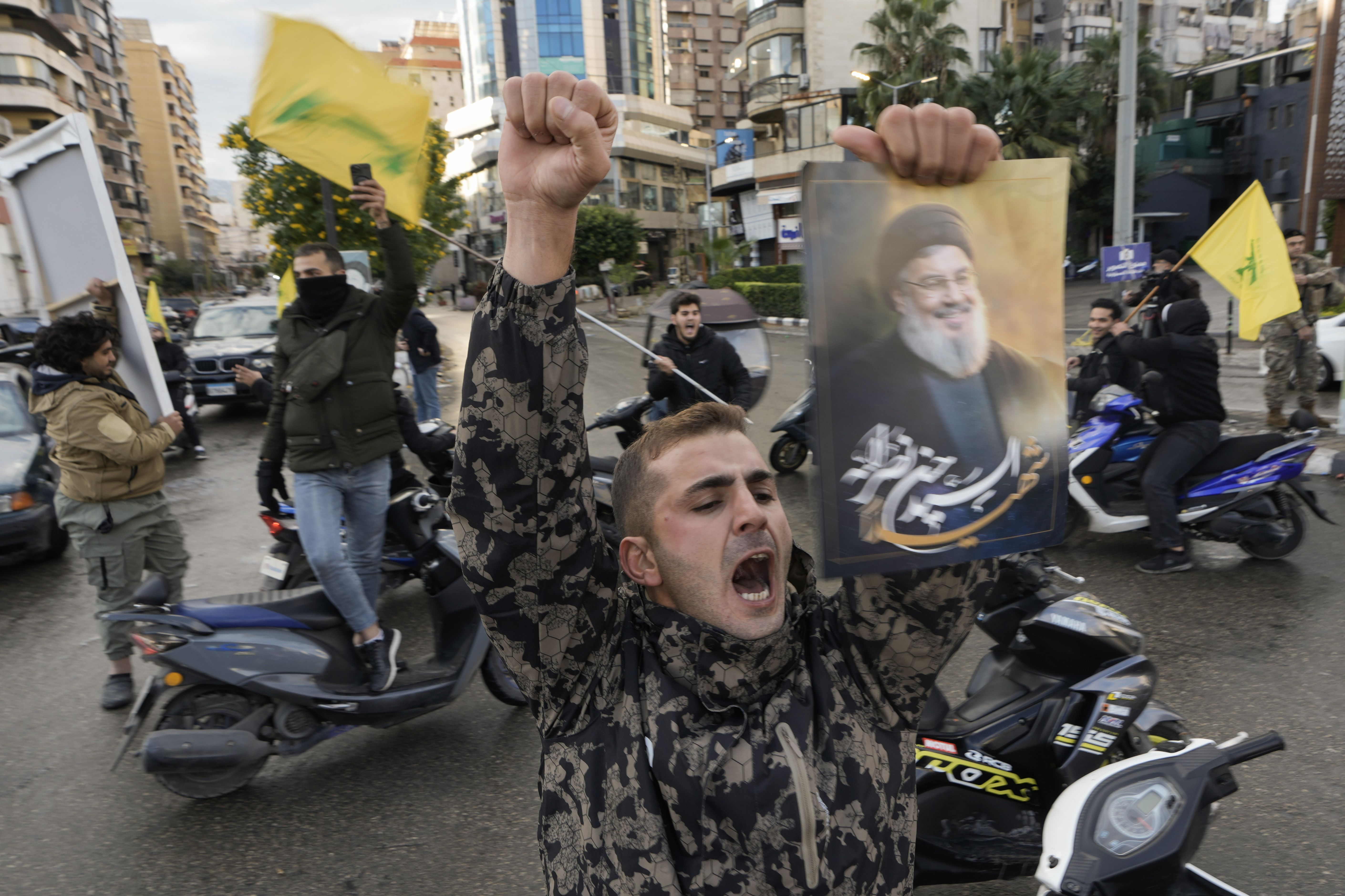 A man celebrates carrying a picture of slain Hezbollah leader Hassan Nasrallah in Dahiyeh, Beirut, Lebanon, following a ceasefire between Israel and Hezbollah that went into effect on Wednesday, November 27, 2024. (Photo by Bilal Hussein/AP Photo)