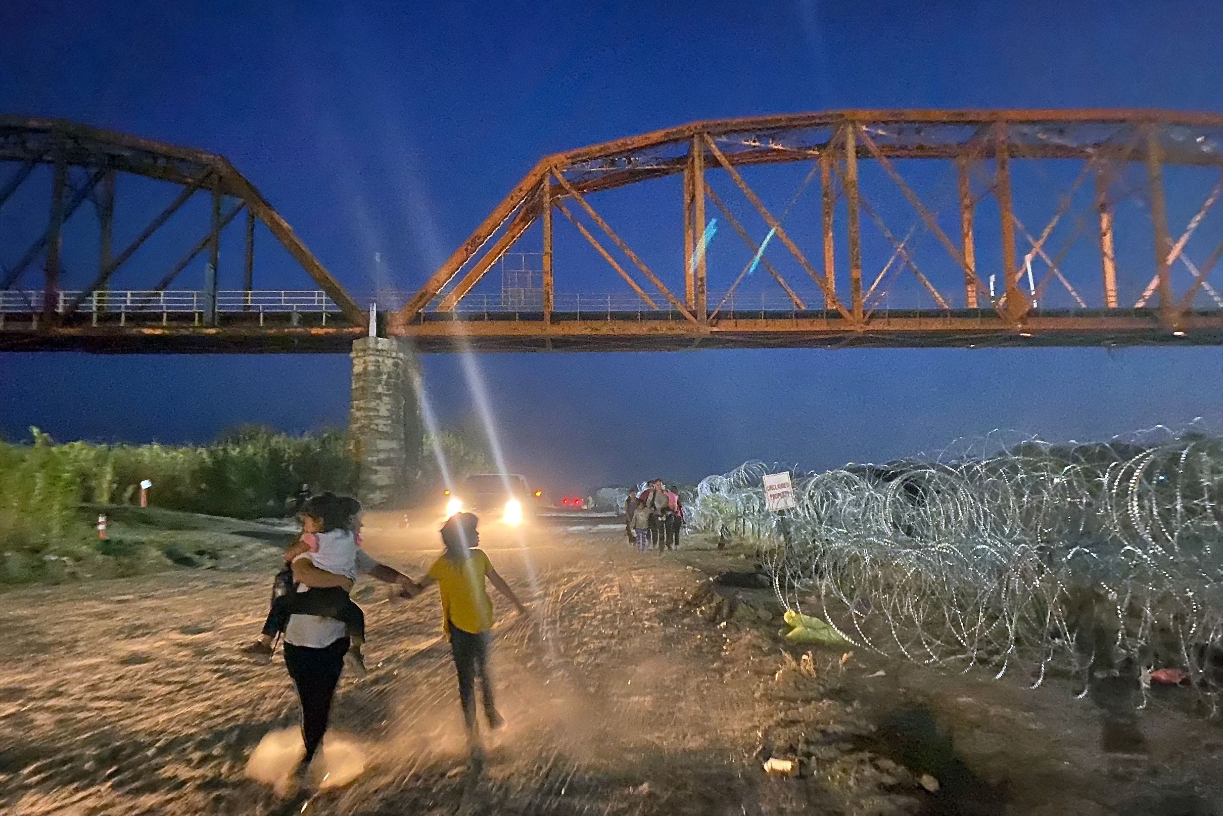 Migrants walk after wading the Rio Grande in the US-Mexico border in Eagle Pass, Texas on September 22, 2023. (Photo by Paula Ramon/AFP Photo)