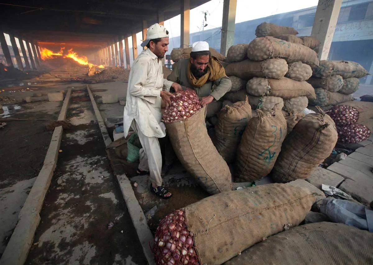Men try to move sacks of onions to a safer place during a fire in a wholesale vegetable and fruit market on the outskirts of Karachi, Pakistan, on March 6, 2013. A fire broke out in the market Wednesday evening, causing massive damage. No casualties were reported. (Photo by Athar Hussain/Reuters)
