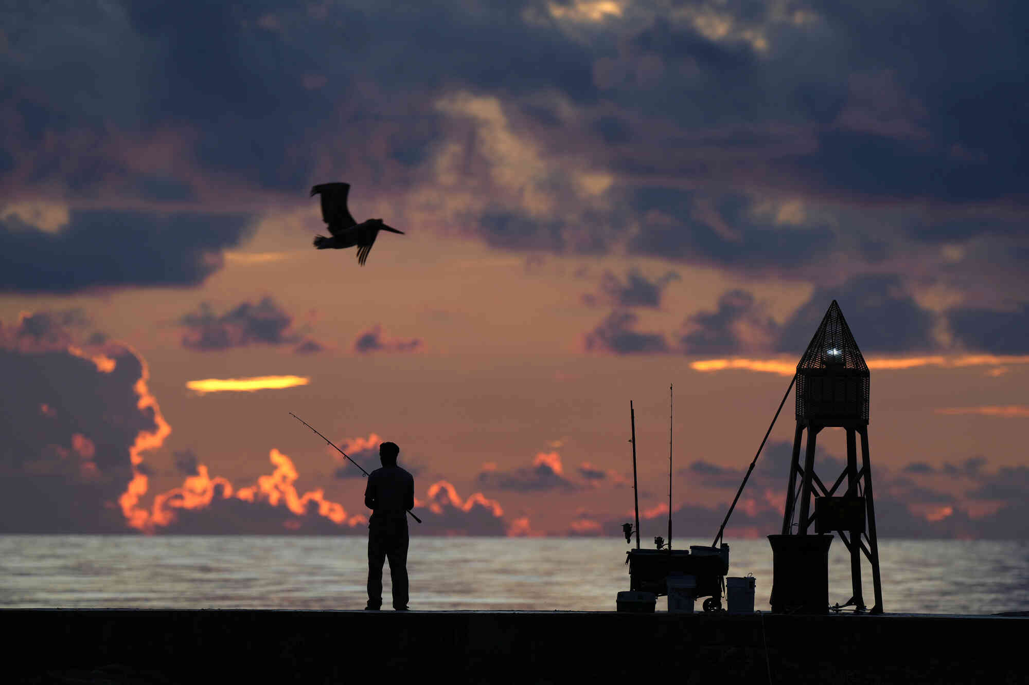 A brown pelican flies over a fisherman just before the sun rises over the Atlantic Ocean, Thursday, October 3, 2024, in Bal Harbour, Fla. (Phoot by Wilfredo Lee/AP Photo)