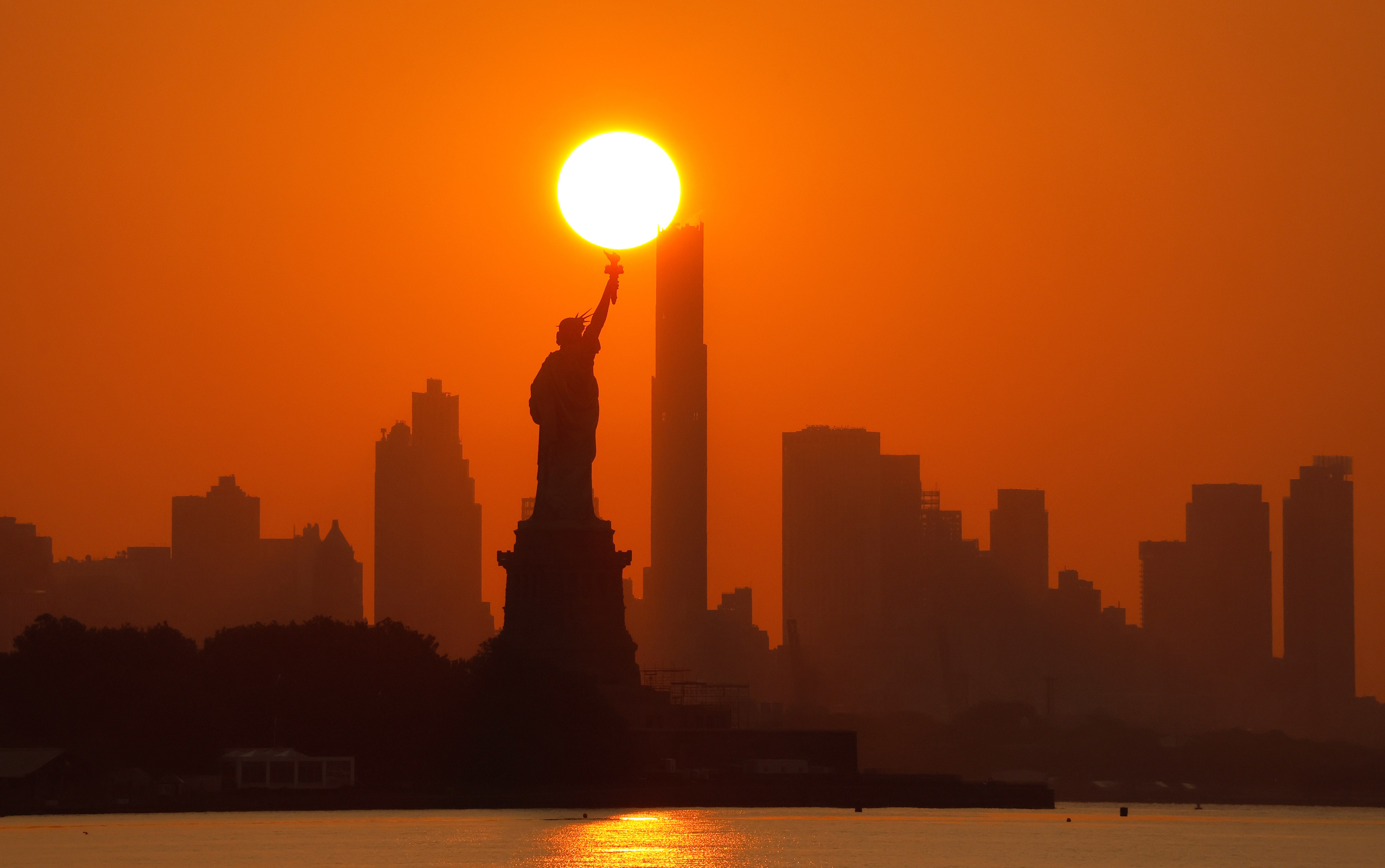 The sun rises behind the Statue of Liberty and the skyline of Brooklyn in New York City on September 14, 2024, as seen from Jersey City New Jersey. (Photo by Gary Hershorn/Getty Images)