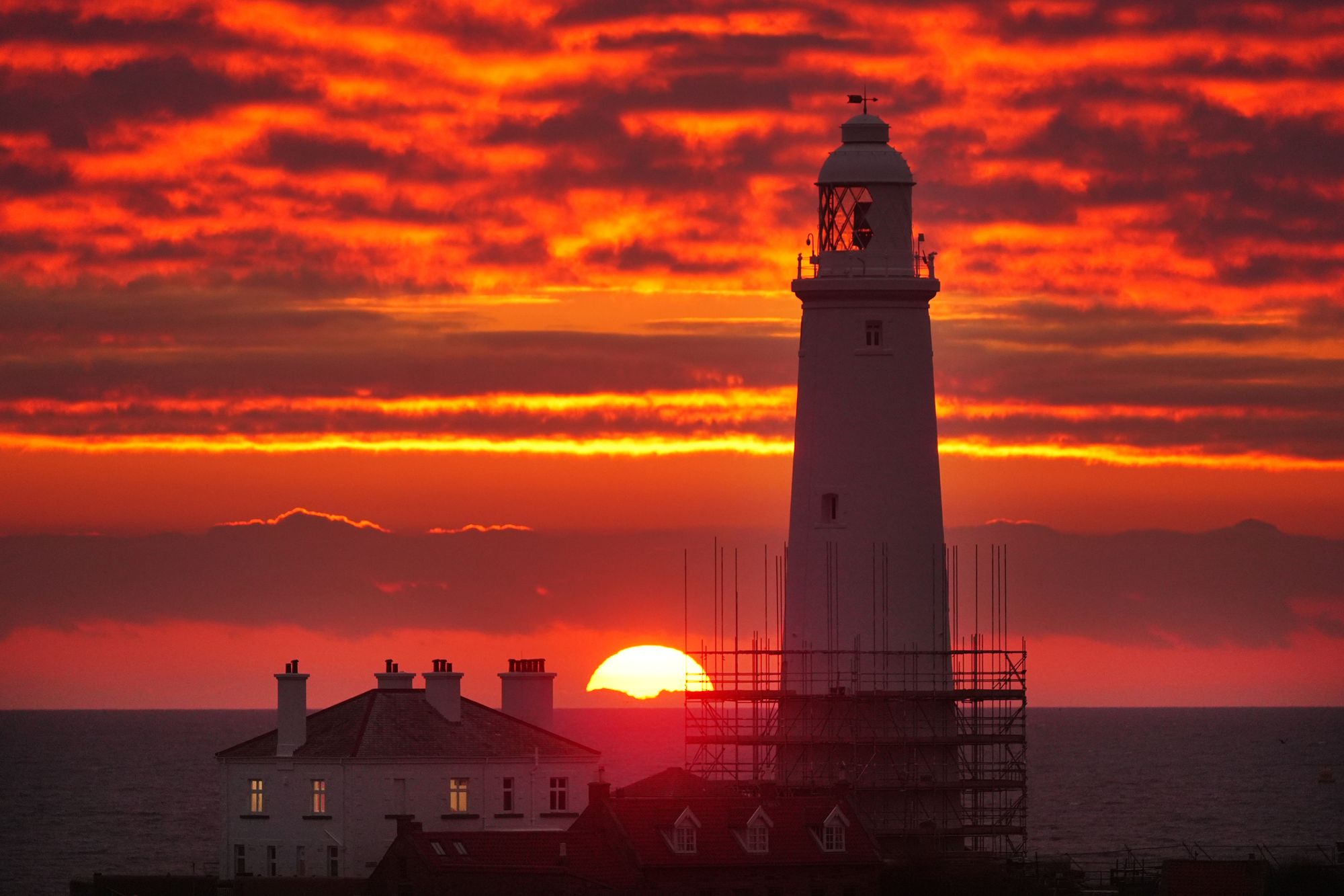 The sun rises over St Mary's Lighthouse in Whitley Bay, North Tyneside, UK on Tuesday, October 15, 2024. (Photo by Owen Humphreys/PA Images via Getty Images)