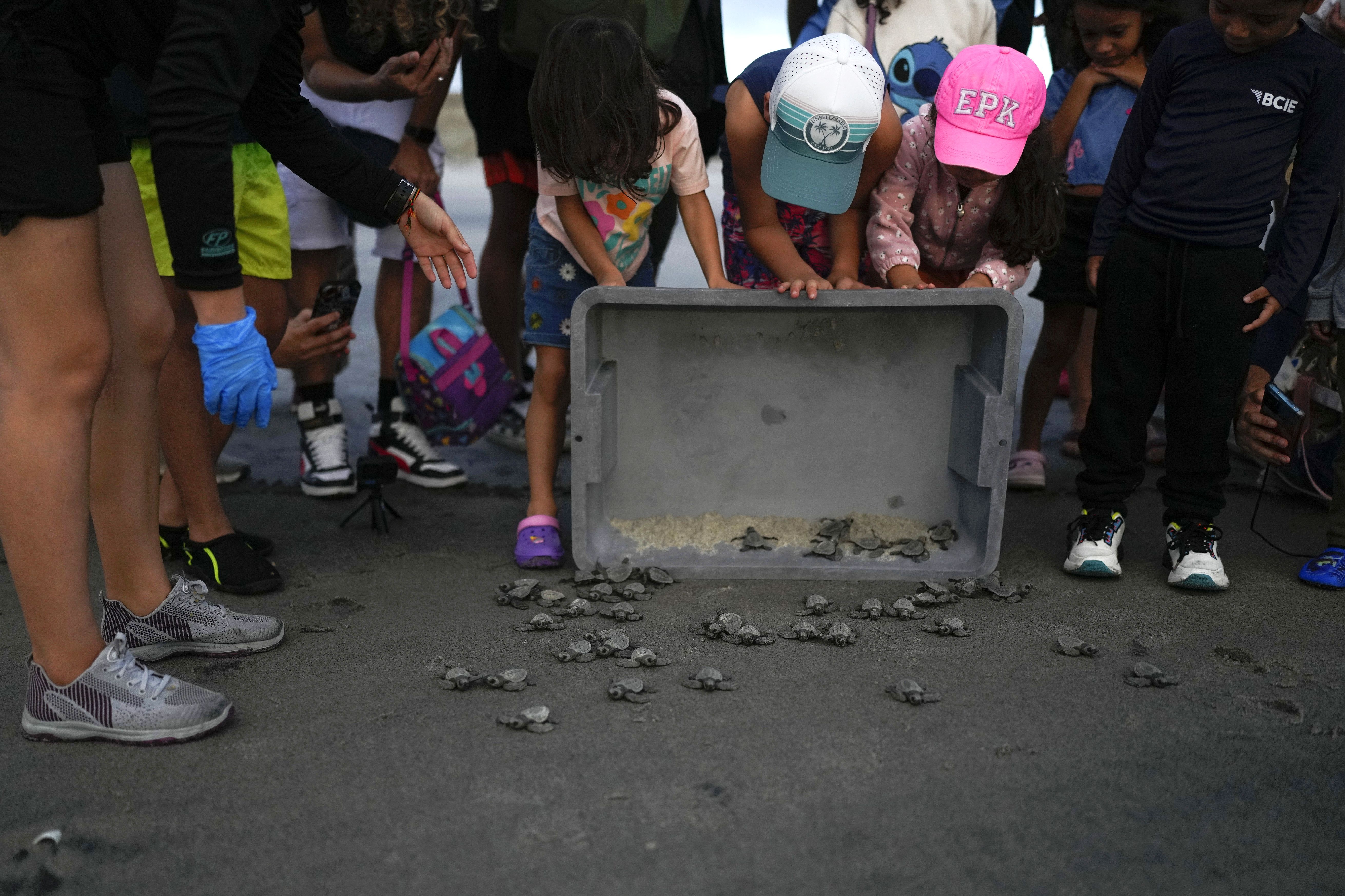 Children watch as baby sea turtles are released into the ocean from Punta Chame beach, Panama, November 16, 2024. (Photo by Matias Delacroix/AP Photo)