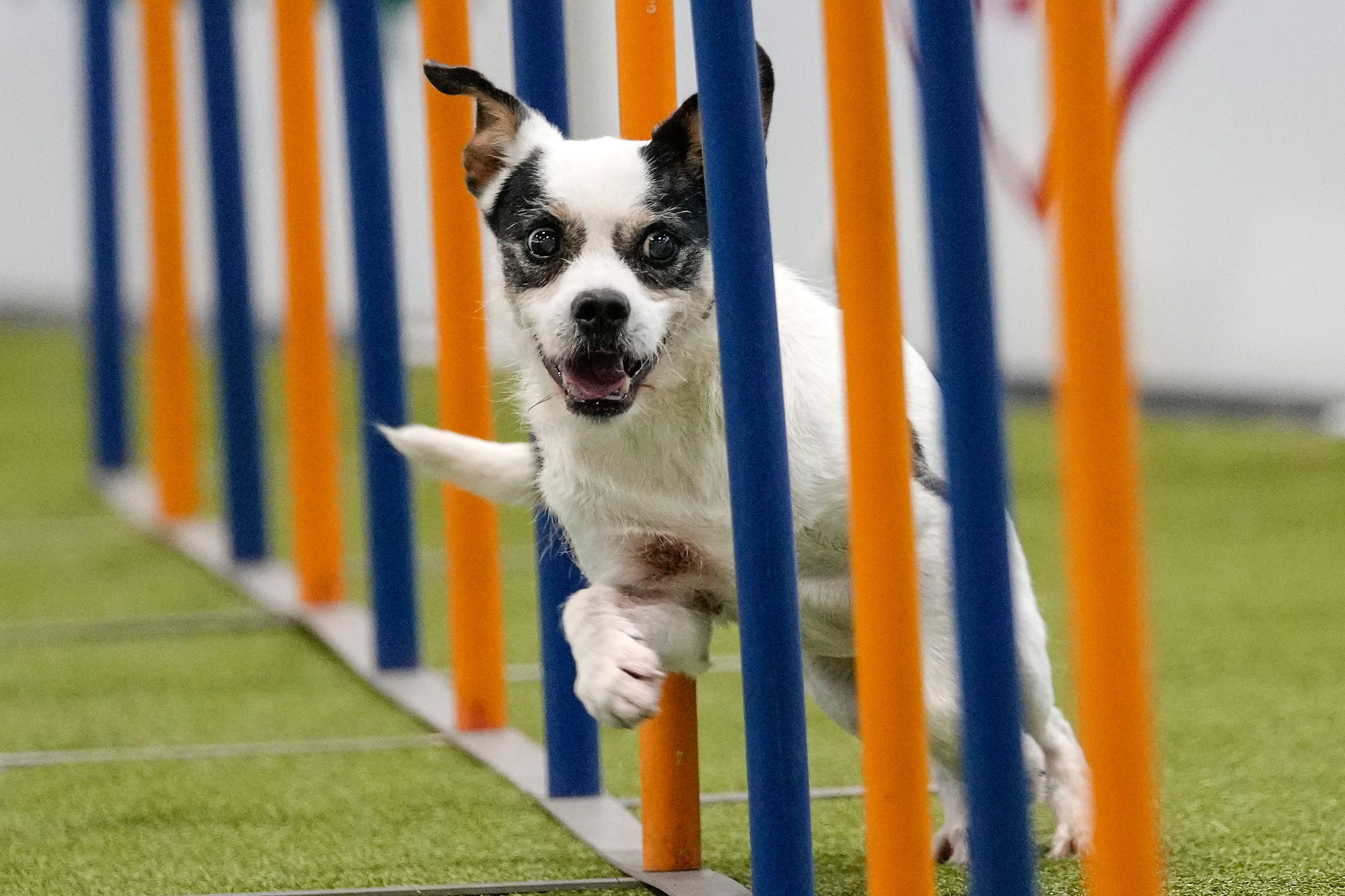 A dog competes for an agility trophy at a dog show in Dortmund, Germany, Friday, November 8, 2024. (Phoot by Martin Meissner/AP Photo)