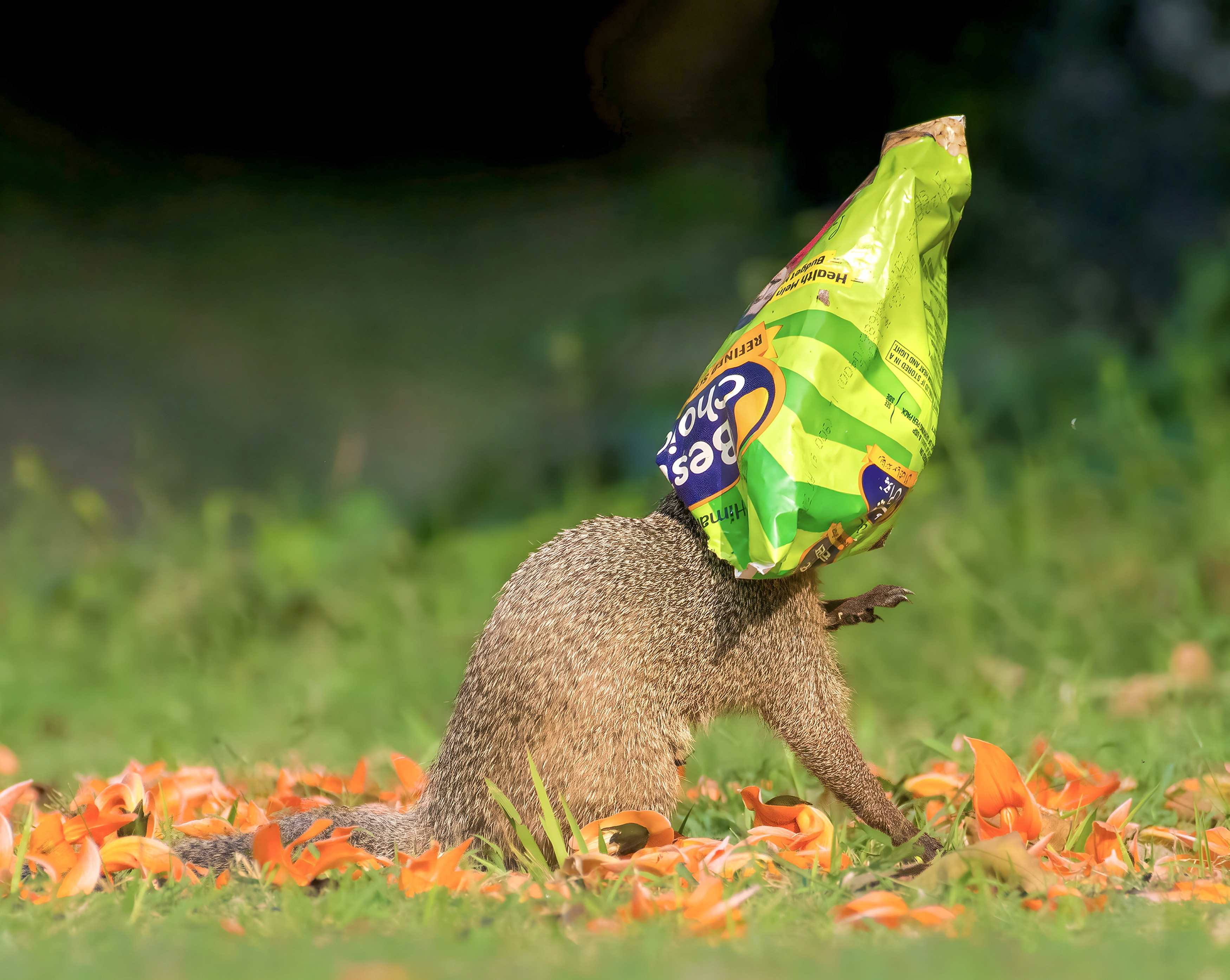 A discarded food packet proves too tempting for a hungry mongoose in search of a meal in Kolkata, India in the second decade of November 2024. (Photo by Prasenjit Dutta/Solent News)