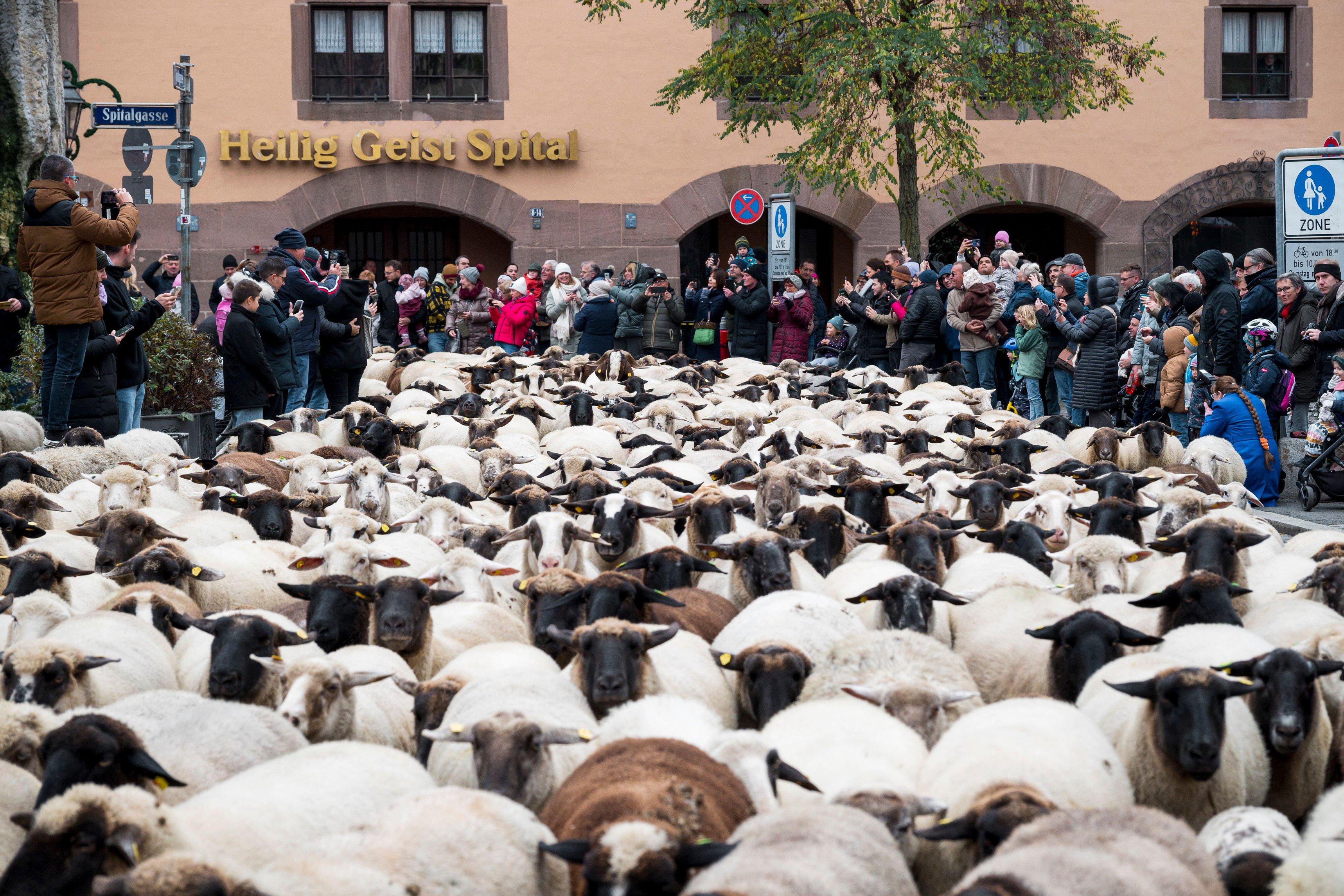 Around 700 sheep are led through Nuremberg's city center, Germany on November 17, 2024. Shepherd Thomas Gackstatter, his children and helpers parade around 700 sheep through Nuremberg's city center to bring the animals to their winter pastures. (Photo by Daniel Vogl/dpa/Alamy Live News)