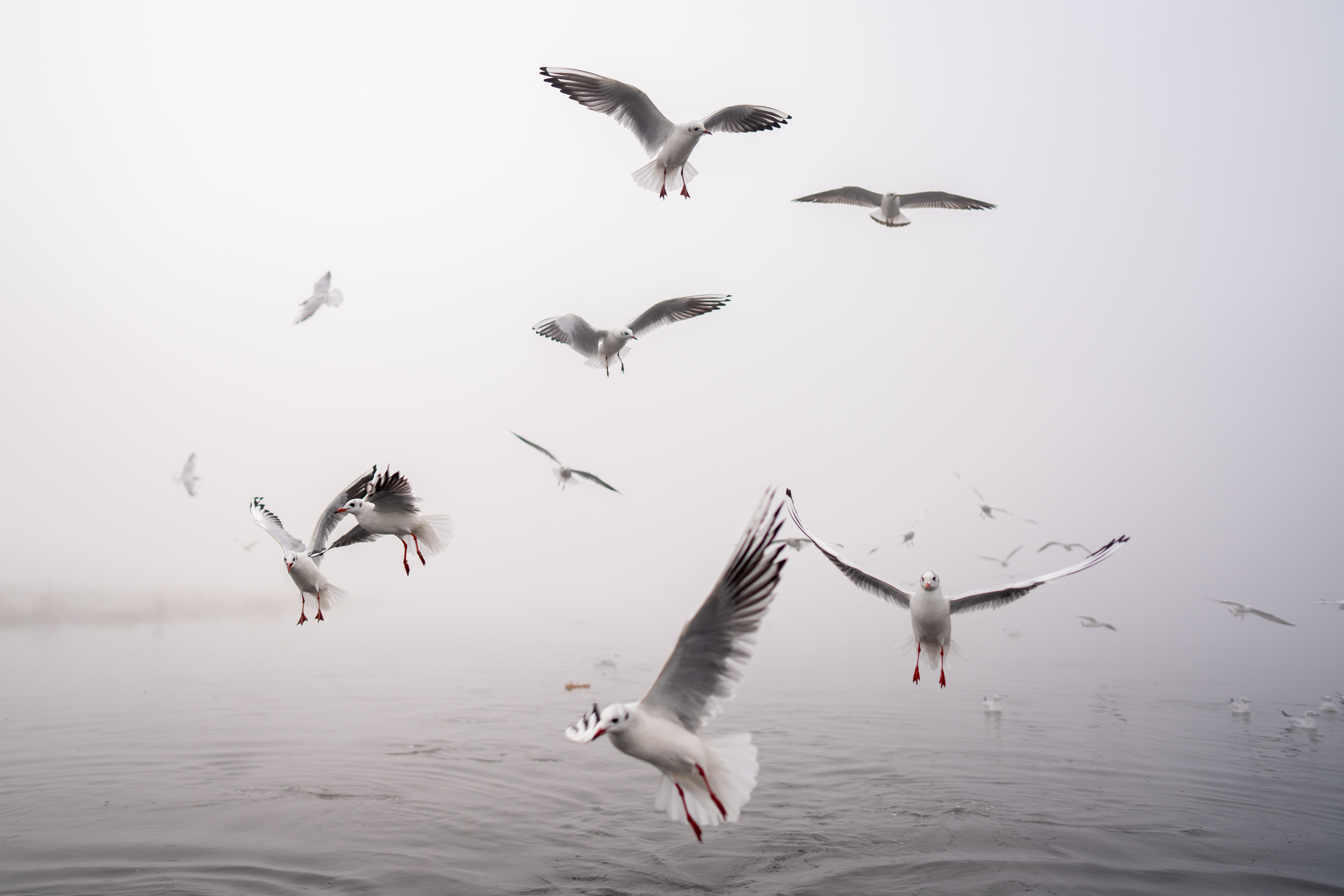 Seagulls fly over the Yamuna river engulfed in a thick layer of smog in New Delhi on November 14, 2024. As the city's air quality declined to absolutely horrible levels, residents of New Delhi, the capital of India, woke up to a heavy layer of smog. Falling temperatures, smoke, dust, low wind speed, vehicle emissions, and burning crop stubble are the main causes of the hazardous air that the northern states and the nation's capital face every year from October to January. (Photo by Amarjeet Kumar Singh/Anadolu via Getty Images)