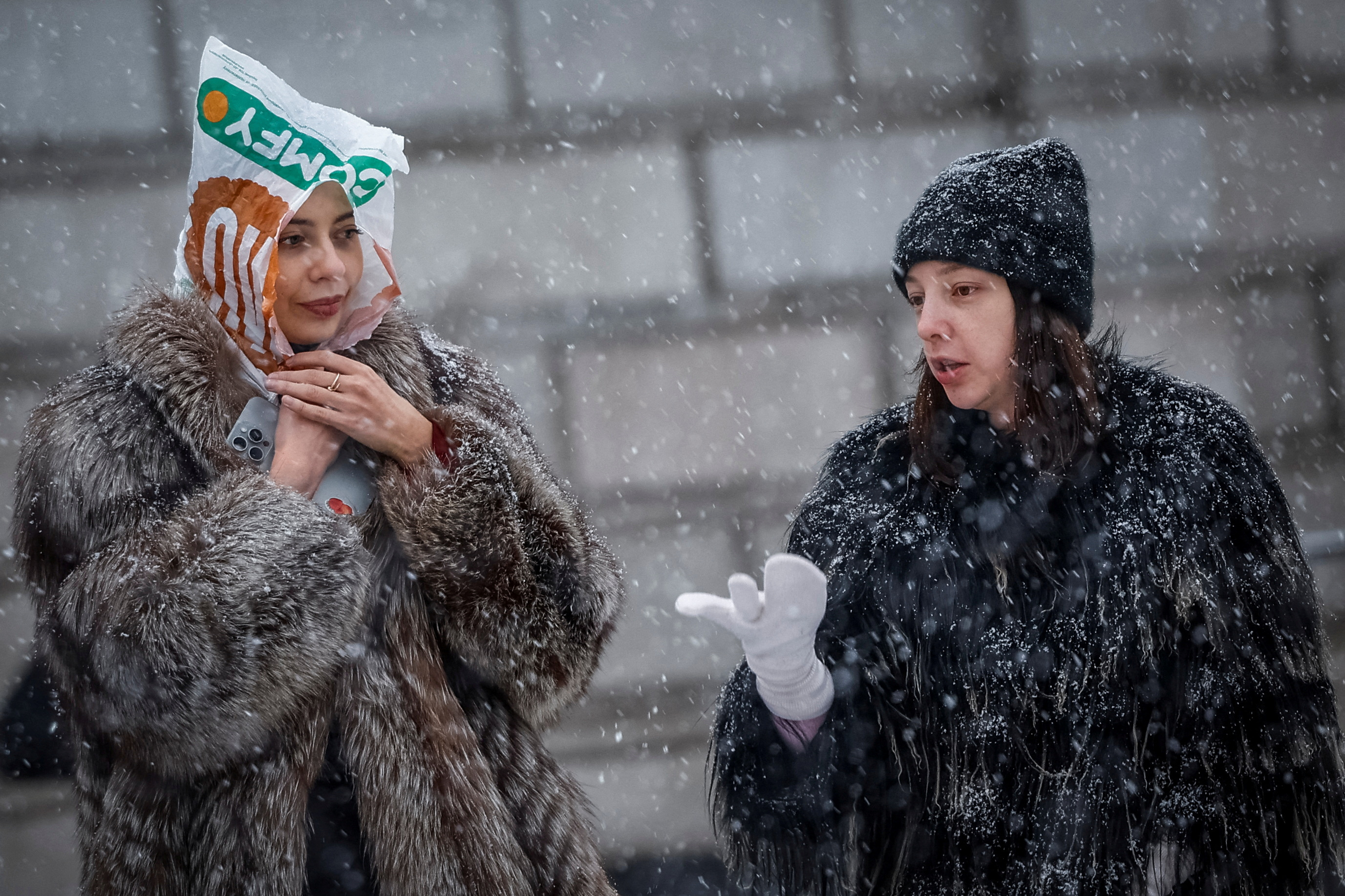 Women walk on a snow-covered street during a snowfall, in Kyiv, Ukraine on November 22, 2024. (Photo by Alina Smutko/Reuters)