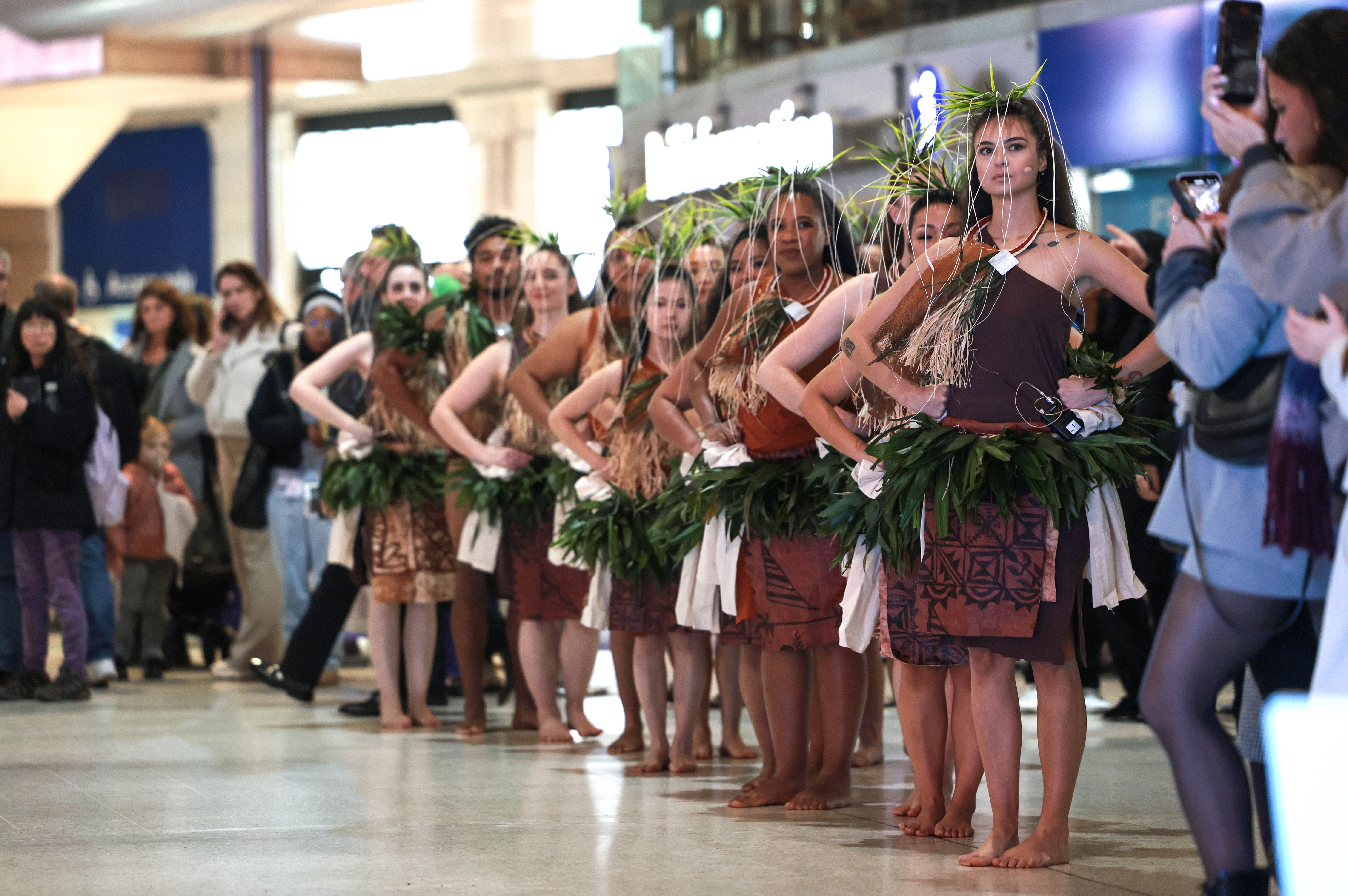 Performers are seen as Abigail Barlow and Emily Bear give a special performance from Walt Disney Animation Studios' “Moana 2” at Waterloo Station on November 26, 2024 in London, England. (Photo by Shane Anthony Sinclair/Getty Images for The Walt Disney Company Limited)