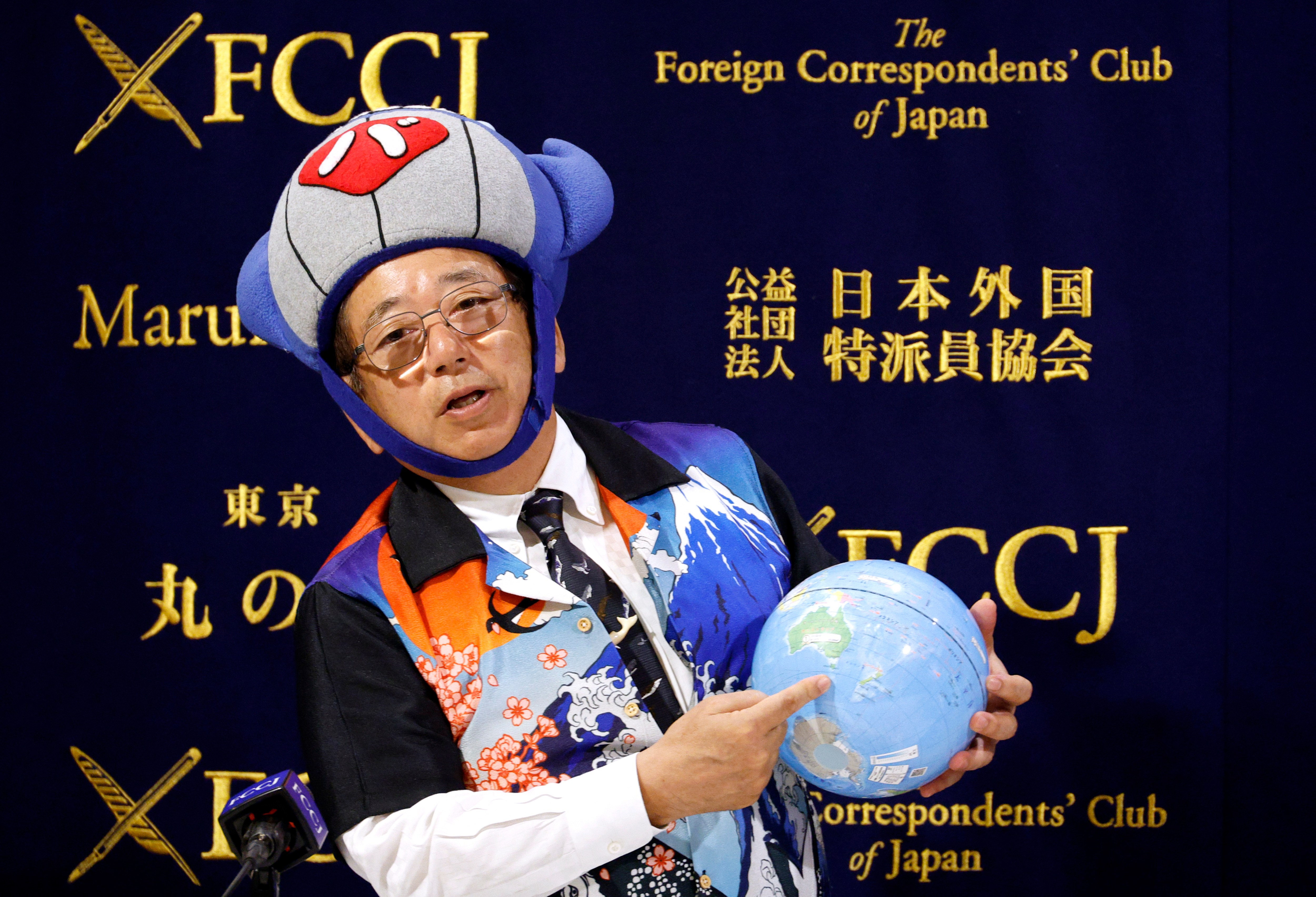 Wearing whale shaped headgear, Hideki Tokoro, CEO of Kyodo Senpaku Co., Japan's largest whaling company, speaks during a press conference at the Foreign Correspondents' Club of Japan in Tokyo, Japan, 16 October 2024. Tokoro is promoting whale meat consumption and explained that catching whales is limited to area of Japan's Exclusive Economic Zone (EEZ). According to Tokoro, whales are eating more fish than humans do and catching them will help maintaining fishery resources. For him, whales are not “good to catch but must catch”. (Photo by Franck Robichon/EPA/EFE)