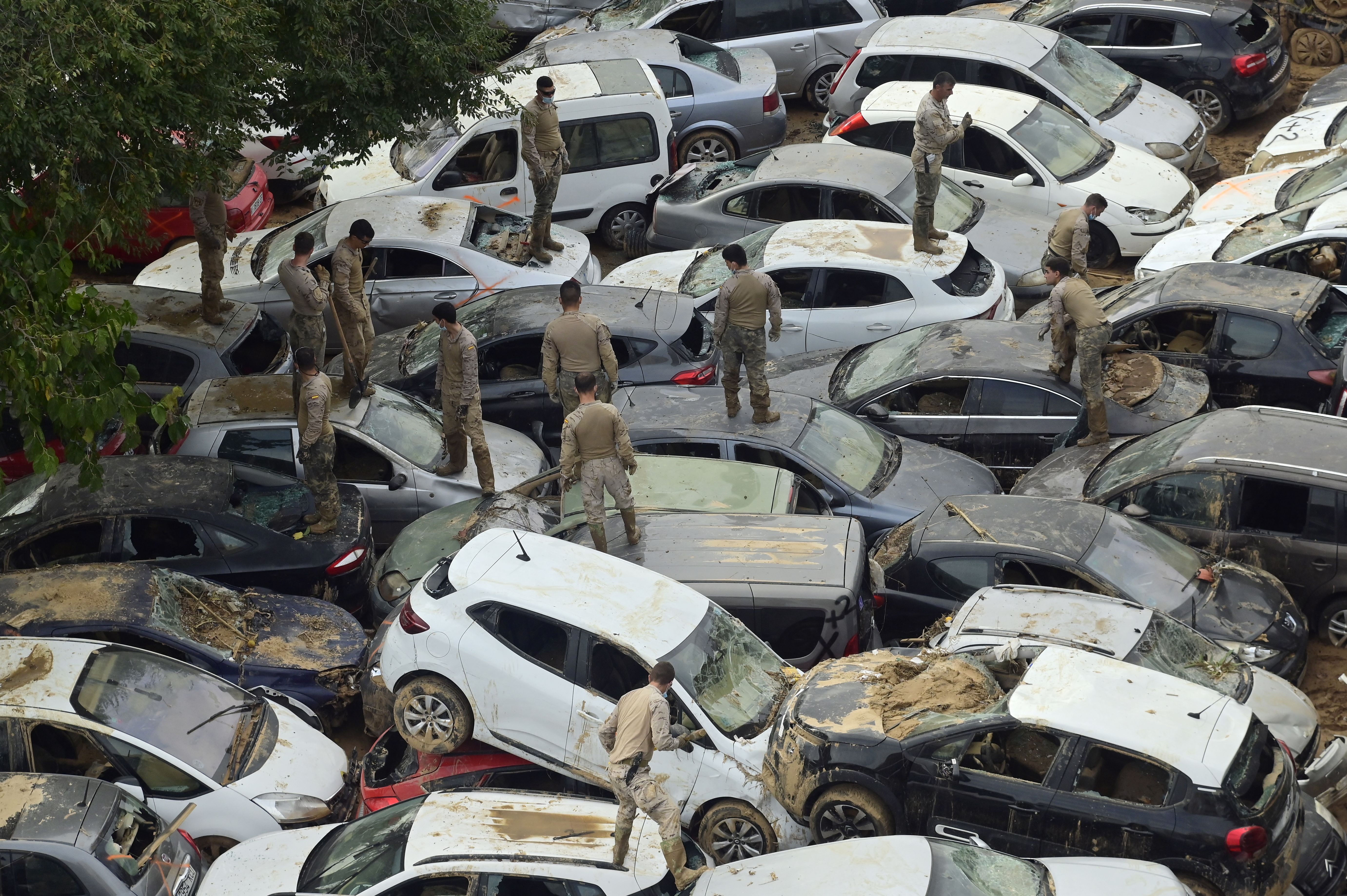 Soldiers search wrecked cars damaged by flooding in Massassana, region of Valencia, eastern Spain, on November 8, 2024, in the aftermath of deadly floods. - The European nation's worst floods in a generation have killed more than 210 people, left dozens missing and submerged entire towns in mud, particularly in the eastern Valencia region. (Photo by Jose Jordan/AFP Photo)
