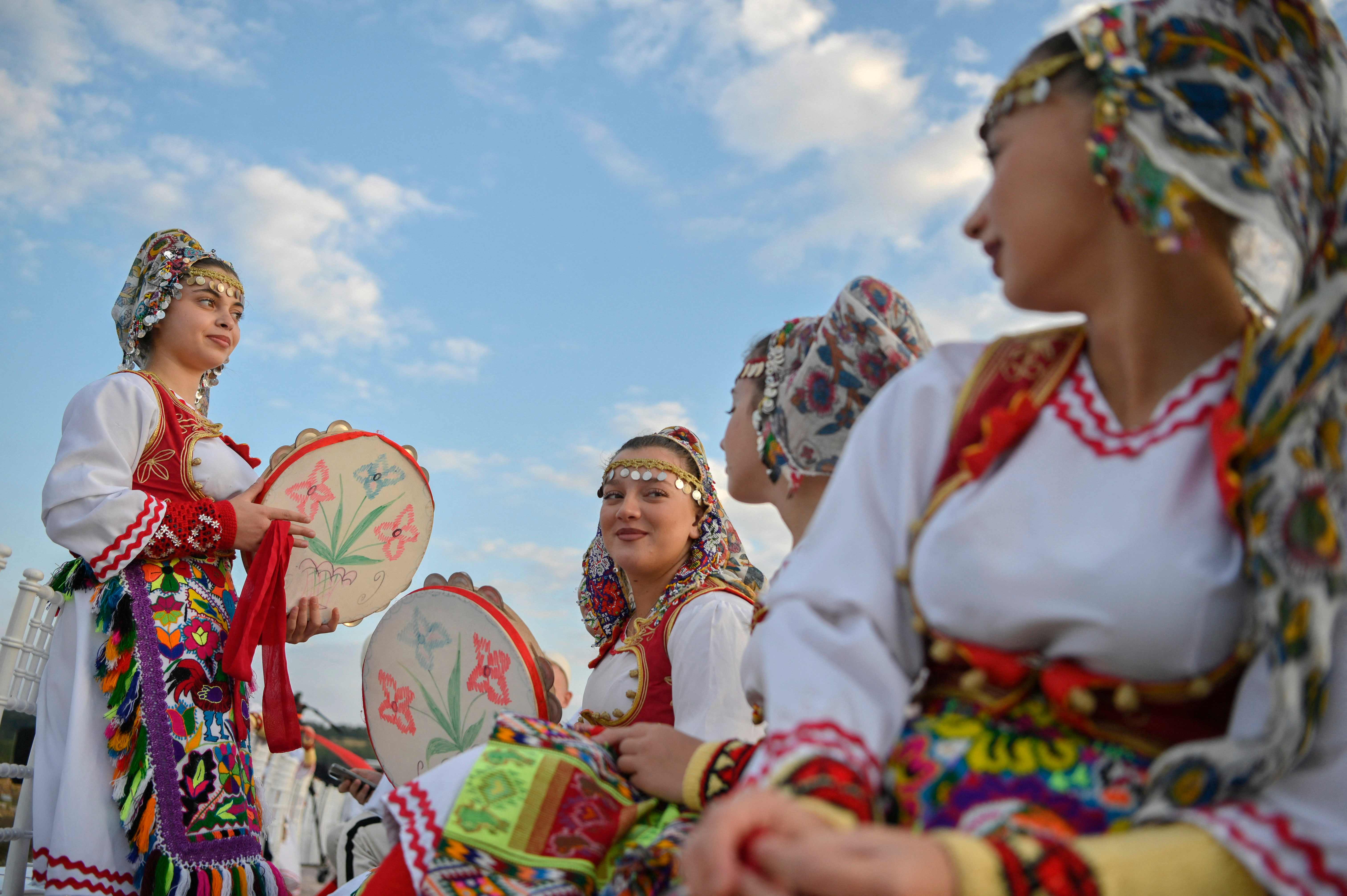 Girls dressed in a traditional costume wait for their performance to start during the Ulpiana Festival held at the archeological site of Ulpiana, near Pristina on September 17, 2023. (Photo by Armend Nimani/AFP Photo)