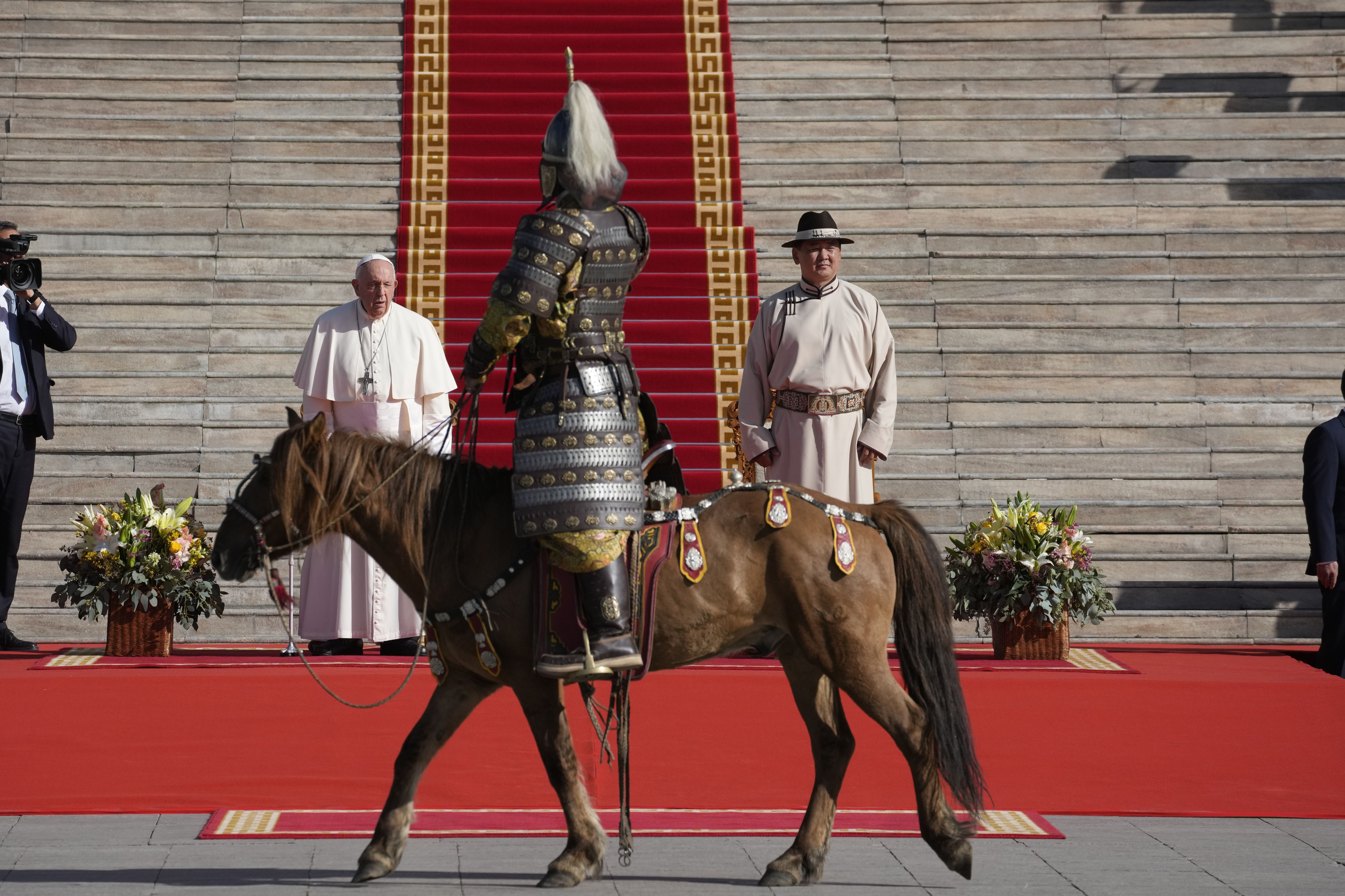 Mongolian President Ukhnaagin Khurelsukh, right, and Pope Francis meet, Saturday, September 2, 2023, in front of the Saaral Ordon Government Building in Sukhbaatar Square in Ulaanbaatar. Pope Francis arrived in Mongolia on Friday morning for a four-day visit to encourage one of the world's smallest and newest Catholic communities. (Photo by Andrew Medichini/AP Photo)