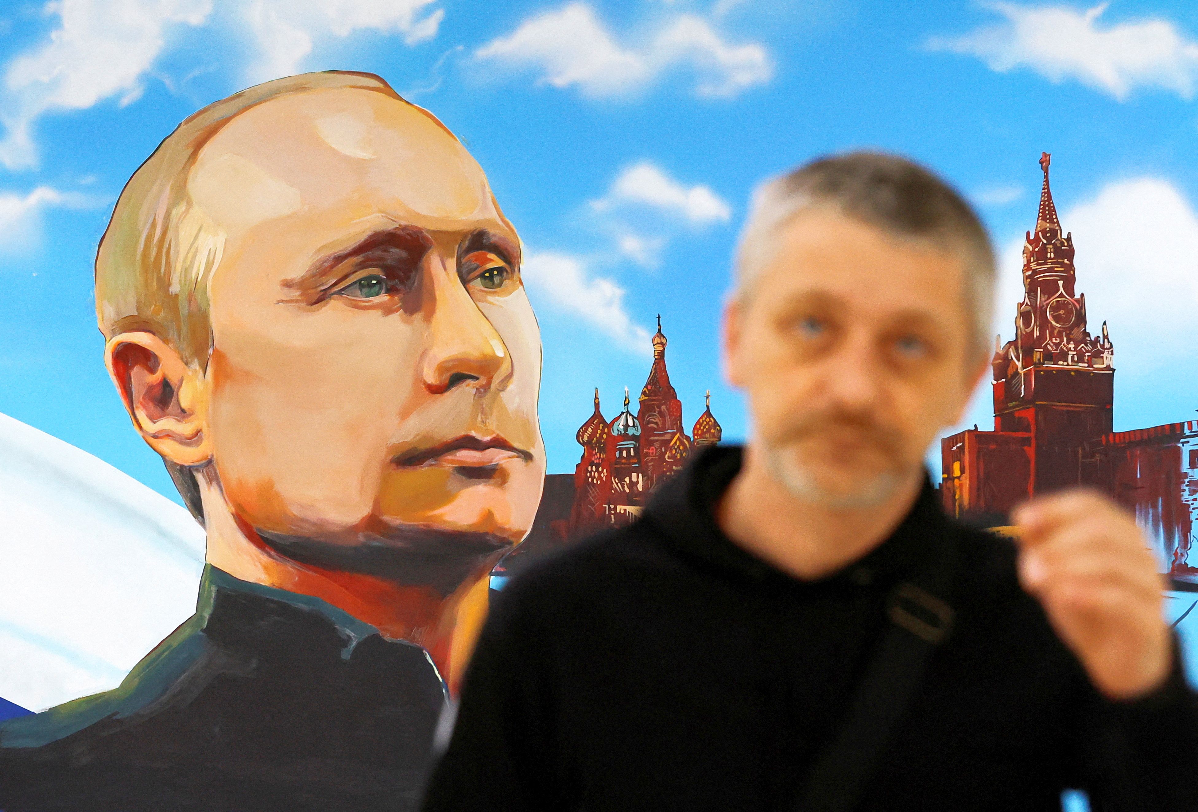 A man walks near a mural depicting Russian President Vladimir Putin, St. Basil's Cathedral and the Moscow Kremlin's Spasskaya Tower at a polling station during local elections held by the Russian-installed authorities in the course of Russia-Ukraine conflict in Donetsk, Russian-controlled Ukraine on September 8, 2023. (Photo by Alexander Ermochenko/Reuters)